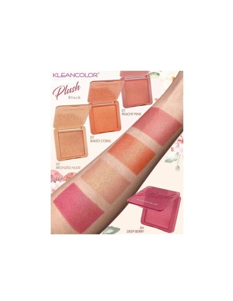 Discover the KleanColor Plush Blush collection, featuring 4 stunning shades Peachy Pink, Baked Coral, Bronzed Nude, and Deep Berry beautifully displayed in a convenient counter-ready setup. Each blush offers a soft, buildable formula that glides effortlessly onto the skin, delivering a silky, satin or shimmer finish.