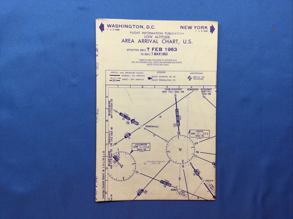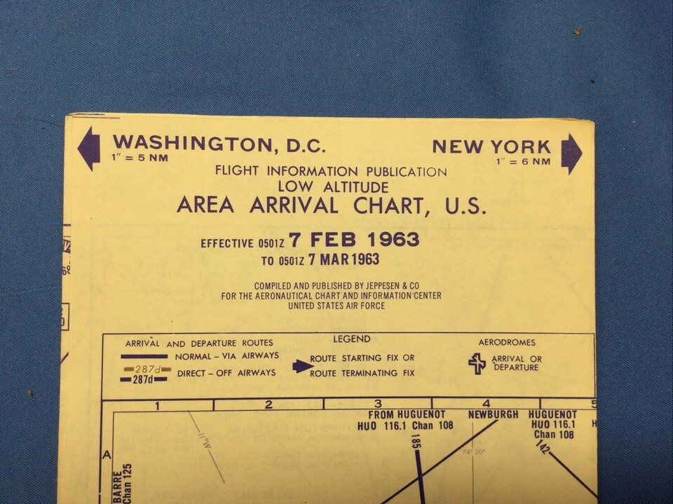 1963 JEPPESEN USAF AIRCRAFT LOW ALTITUDE AREA ARRIVAL CHART/MAP DC & NYC