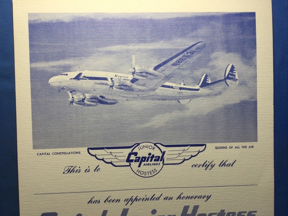1950's Capital Airlines JUNIOR HOSTESSES STEWARDESS FLIGHT ATTENDANT CERTIFICATE
