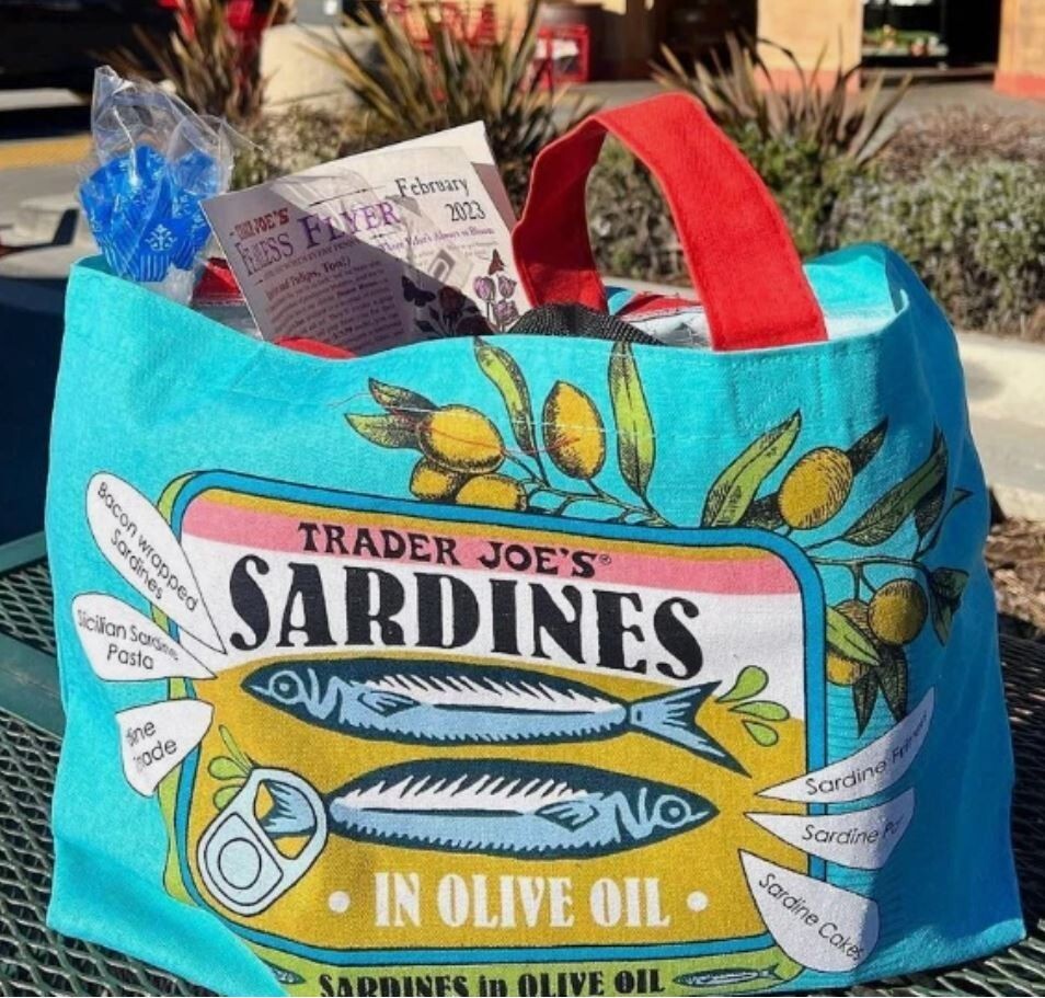 Trader Joe's Market Tote Bag Blue Shopping Sardines Reusable Retro RETIRED NEW