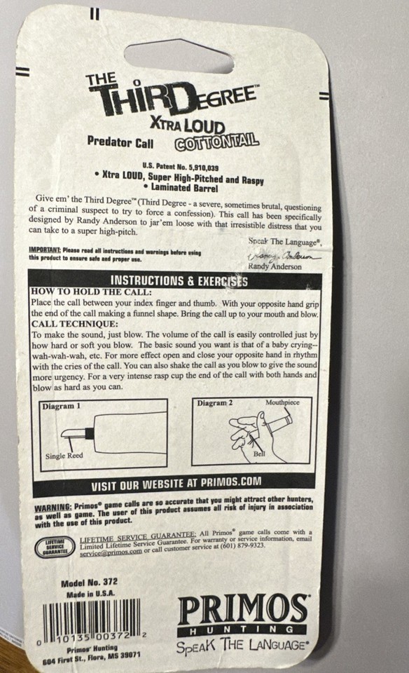 Give 'em the Third Degree? (Third Degree ? a severe questioning of a criminal suspect to obtain a confession). This call has been specifically designed by Randy Anderson to jar 'em loose with that irresistible distress that you can take to a super high pitch.