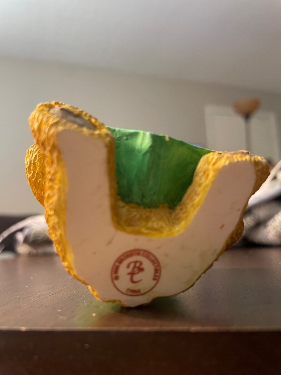 Pre-owned and displayed only. Small chip present on the side of the flower on the hat; otherwise in good condition with no cracks. Please review photos for close-up condition details.