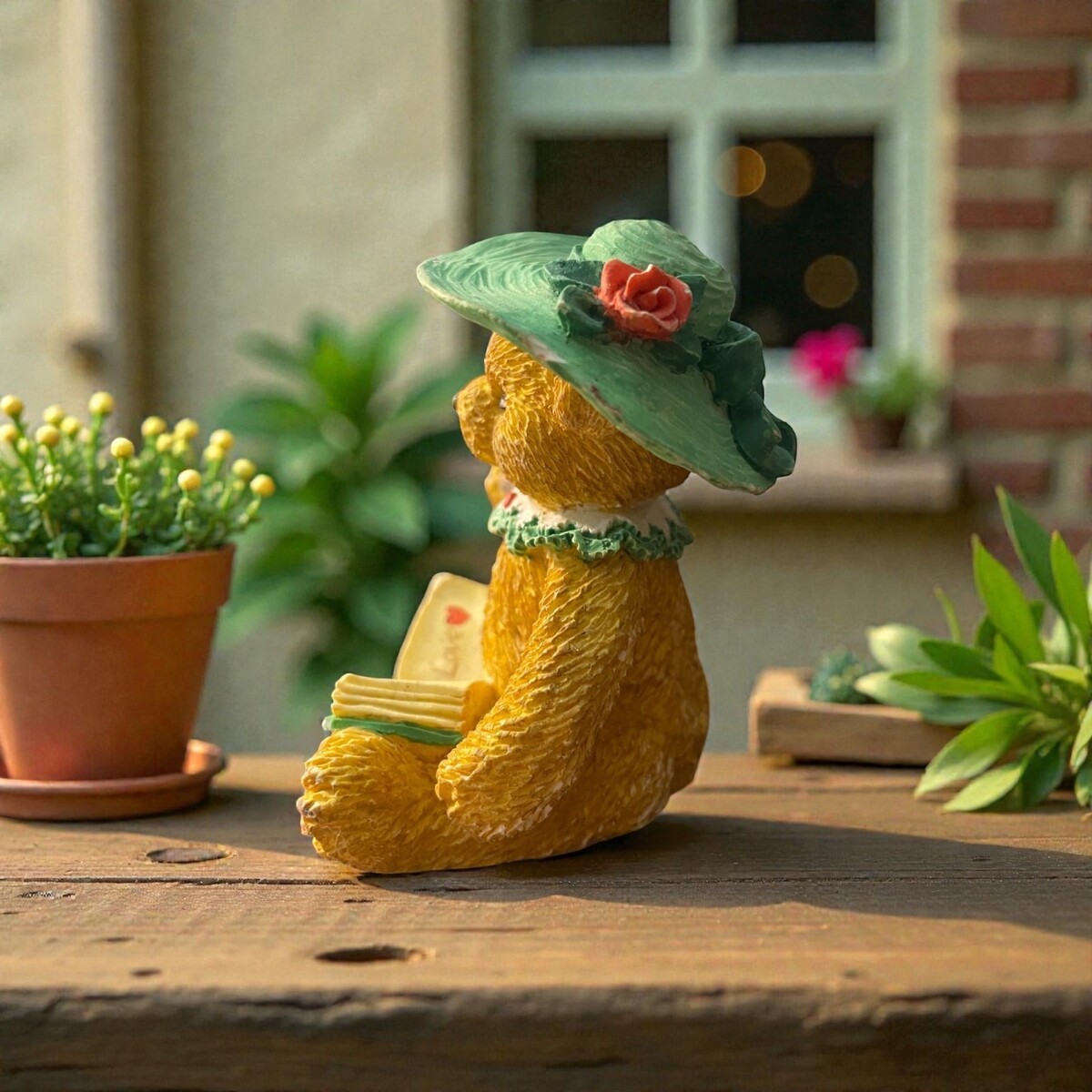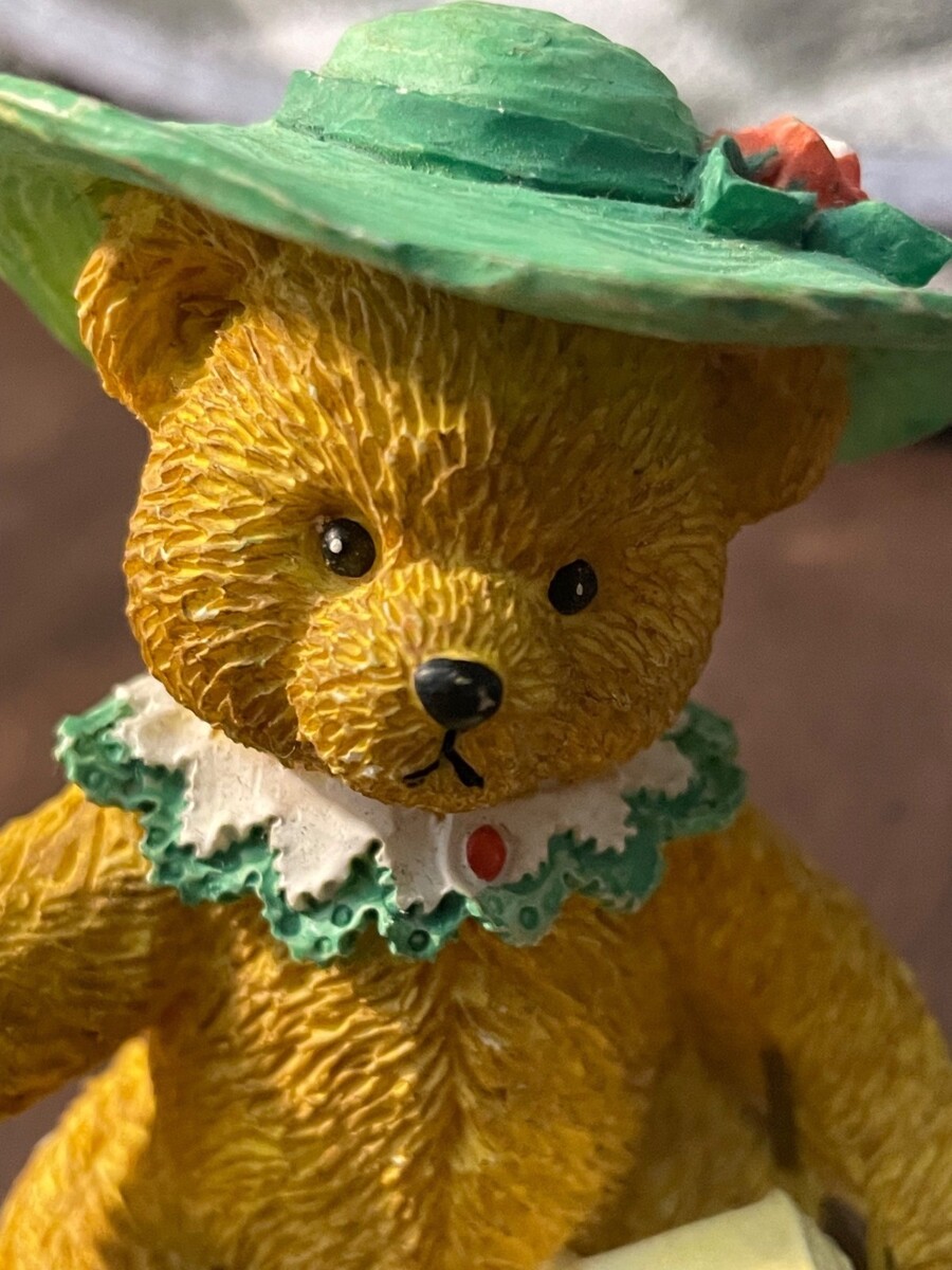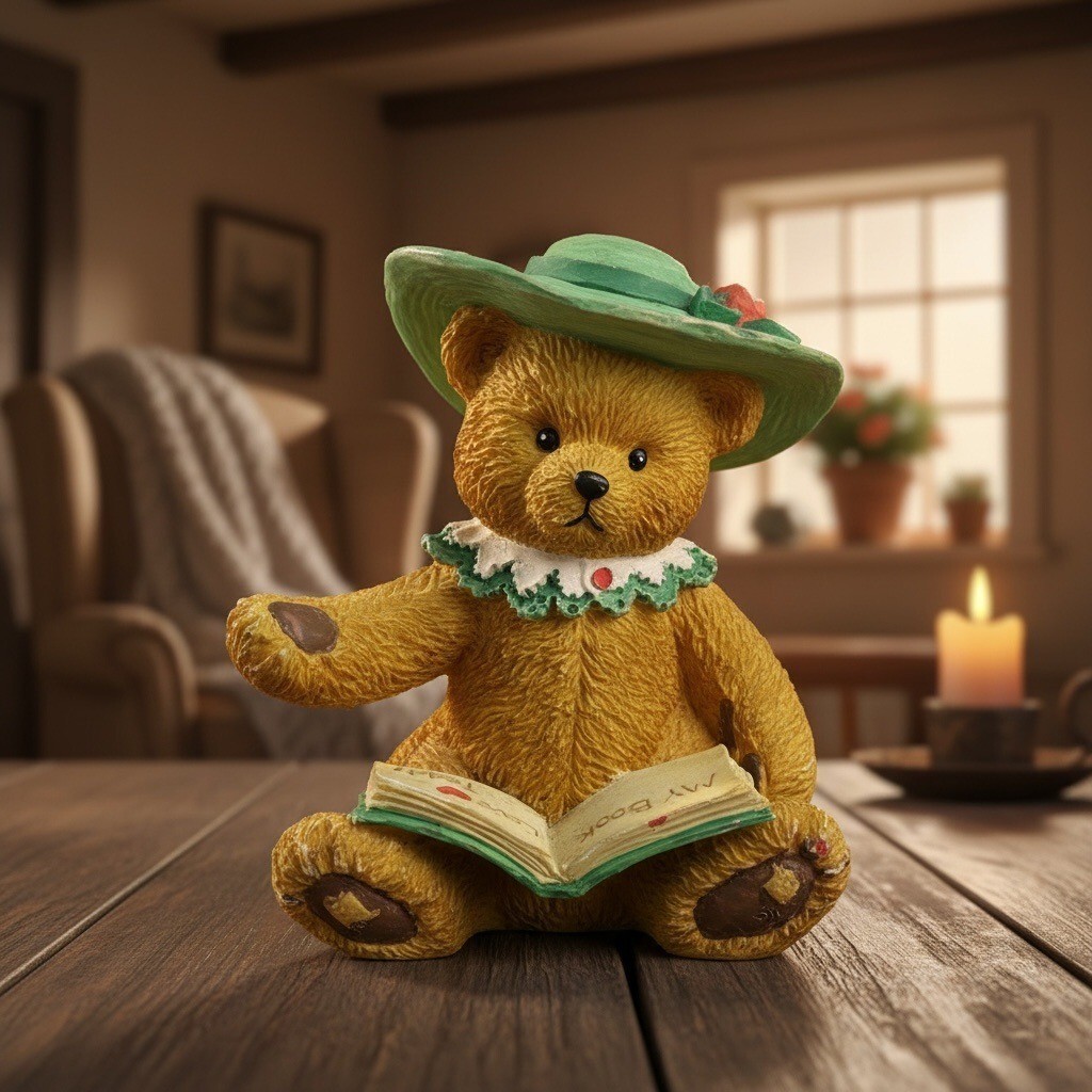 Boyds Bears collectible resin figurine featuring a teddy bear seated and reading a book, wearing a green hat with floral detail. Classic Boyds charm with textured fur and hand-painted details.