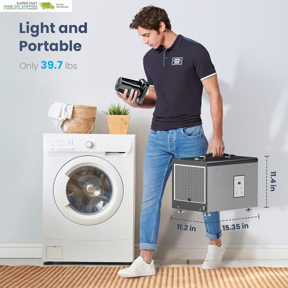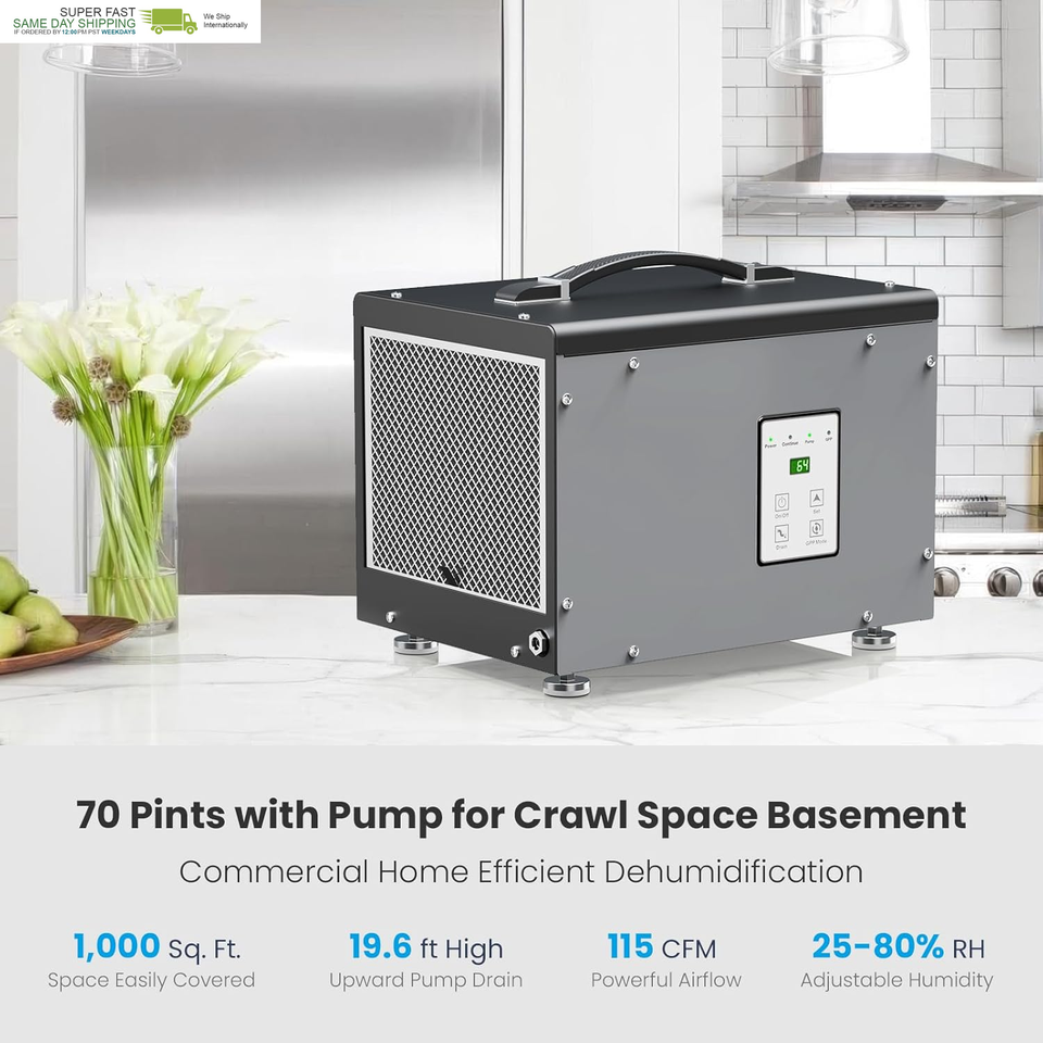 Compact Size Design Dehumidifiers: Our energy star dehumidifiers are the perfect solution for commercial, crawl spaces and basements. Measuring at only 15.35x11.2x11.4 inch(LxWxH), this home dehumidifier is perfect to fit in low-clearance crawlspaces and tight basements.