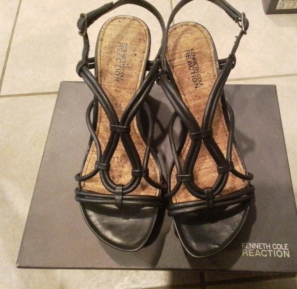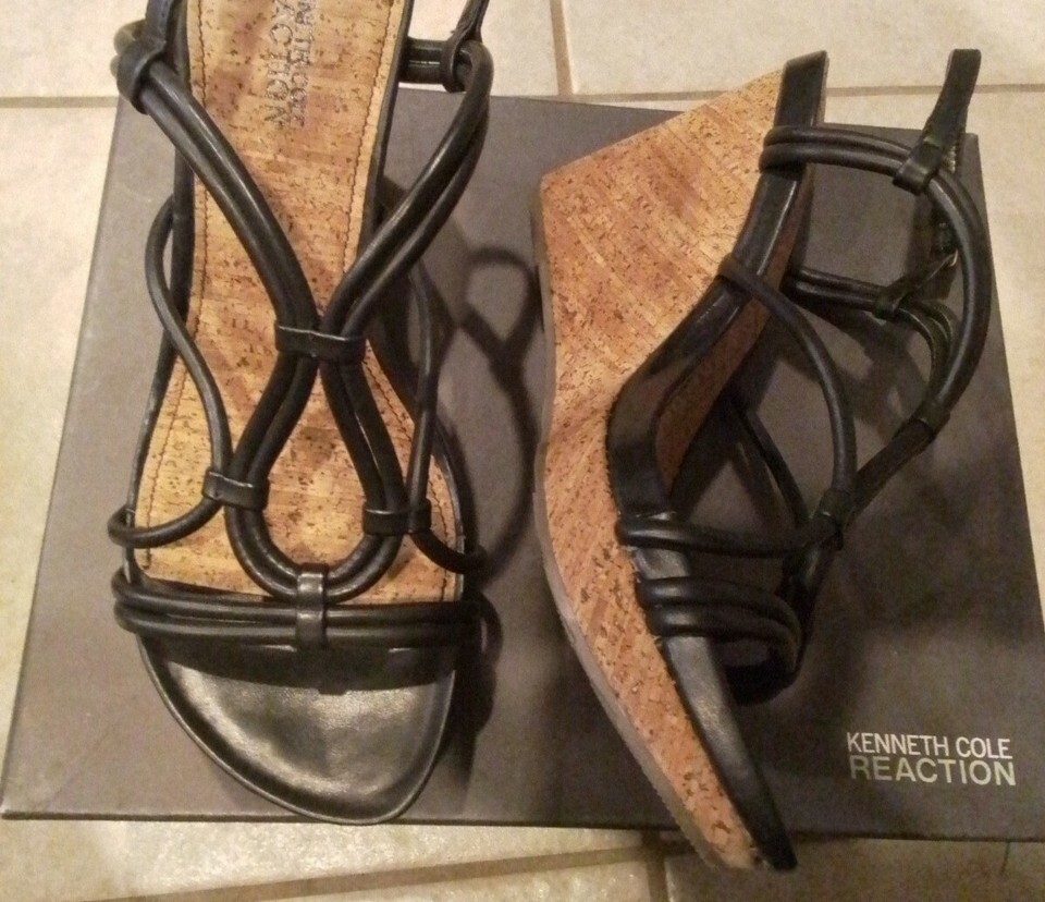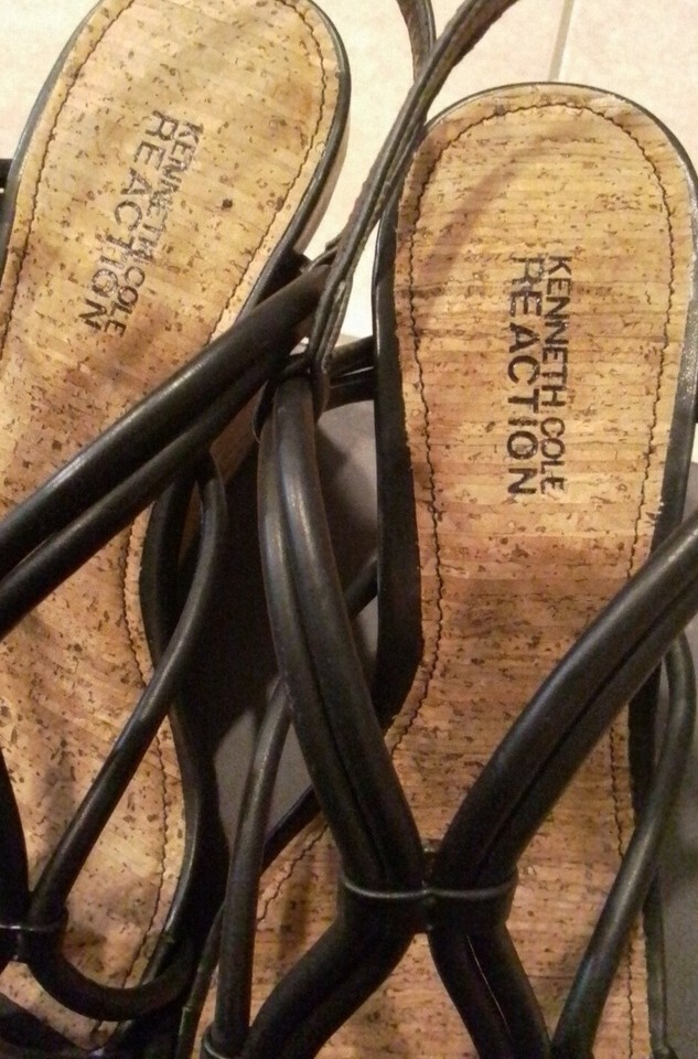 Kenneth Cole Reaction Black Straps Tan Soles Don't Dare Platform Wedges Sandals.