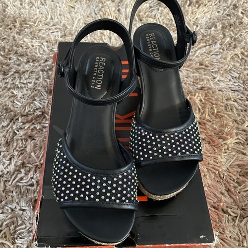 Kenneth Cole Reaction Black Straps Tan Soles Don't Dare Platform Wedges Sandals