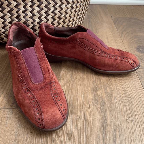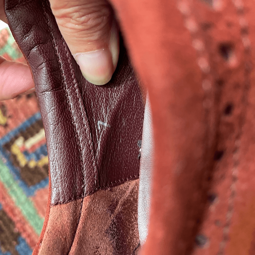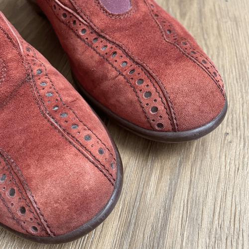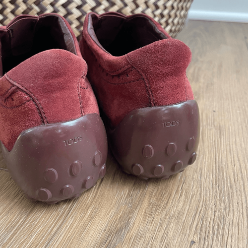 Tod?s luxury brand leather suede slip on driving loafers with nubby man-made sole stamped with branding on the back heel and rust color, brownish orange suede upper with elastic panel for easy on off at the top. The to suede is slightly lighter than the balance of the shoe, but it is more pronounced in my opinion in the photos than presents irl.