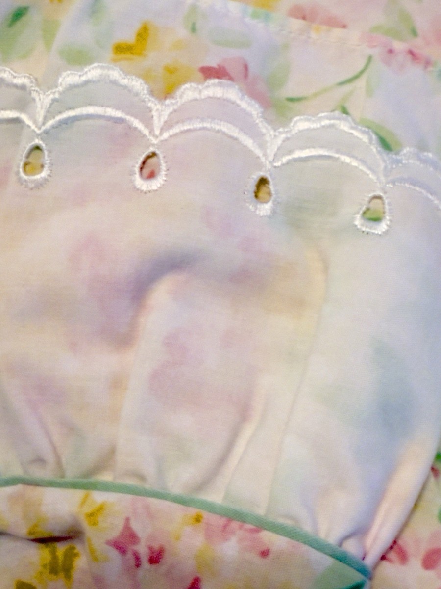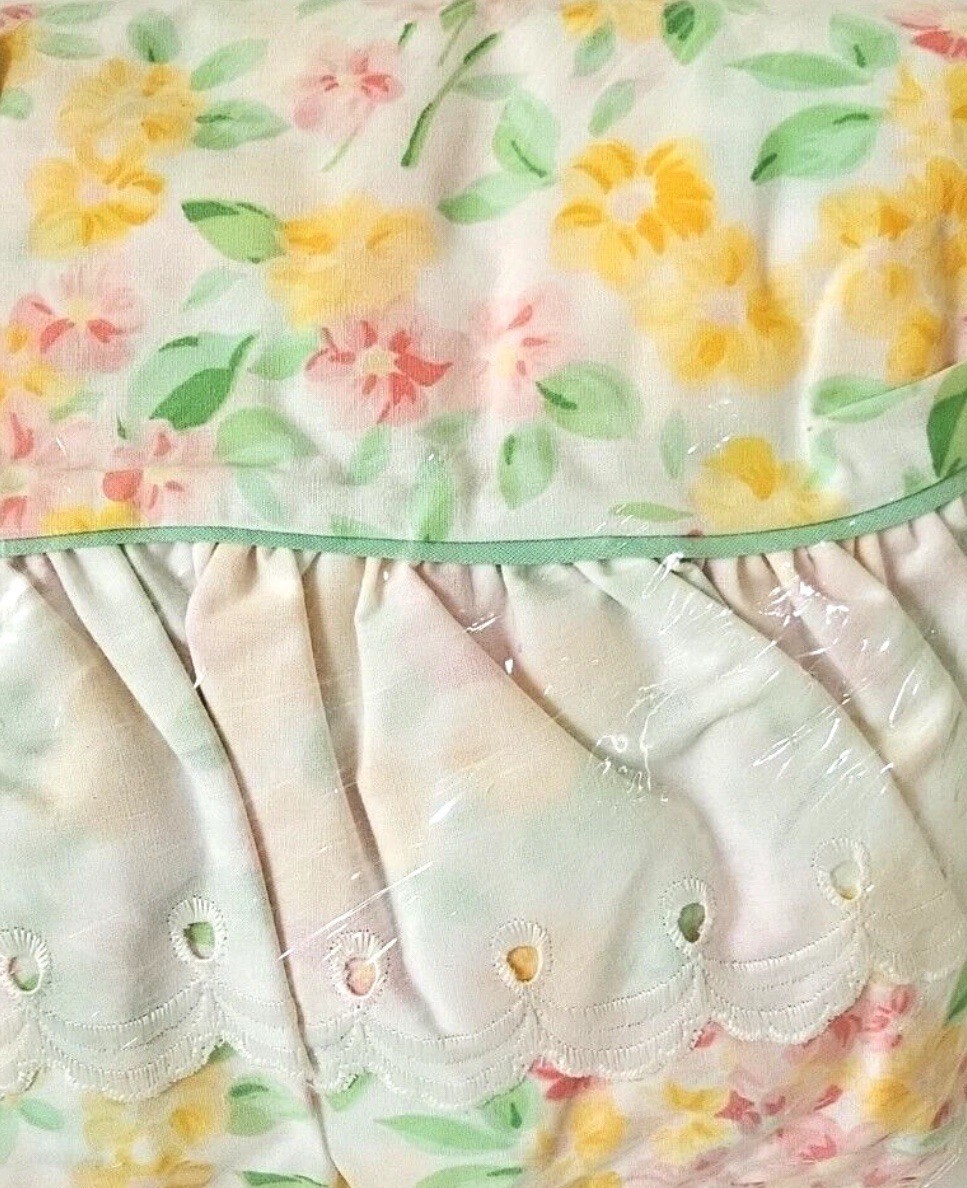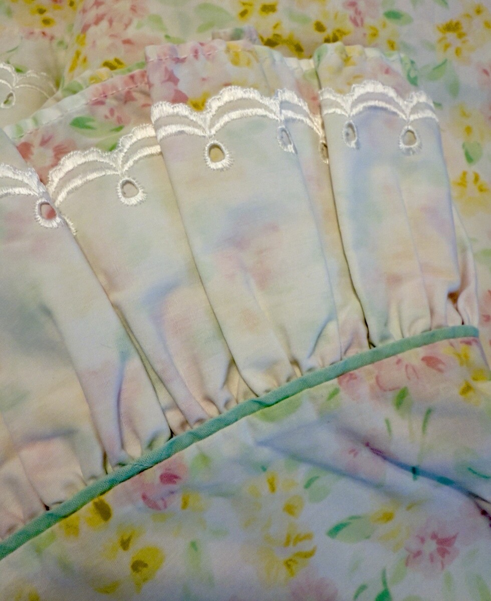 The Westpoint Stevens Garden Estates Sarah Twin Sheet Set in Pink Floral Eyelet Lace is a vintage-style bedding set perfect for a romantic-themed bedroom. Made from a cozy cotton blend material, this set includes a pillowcase, fitted sheet, and flat sheet, all featuring a beautiful floral pattern and eyelet lace detailing. Ideal for all seasons, this set is designed to add a touch of elegance and charm to any twin-sized bed. Made in the United States during the 1990s, this collectible sheet set from Garden Estates is a timeless addition to any bedroom decor.