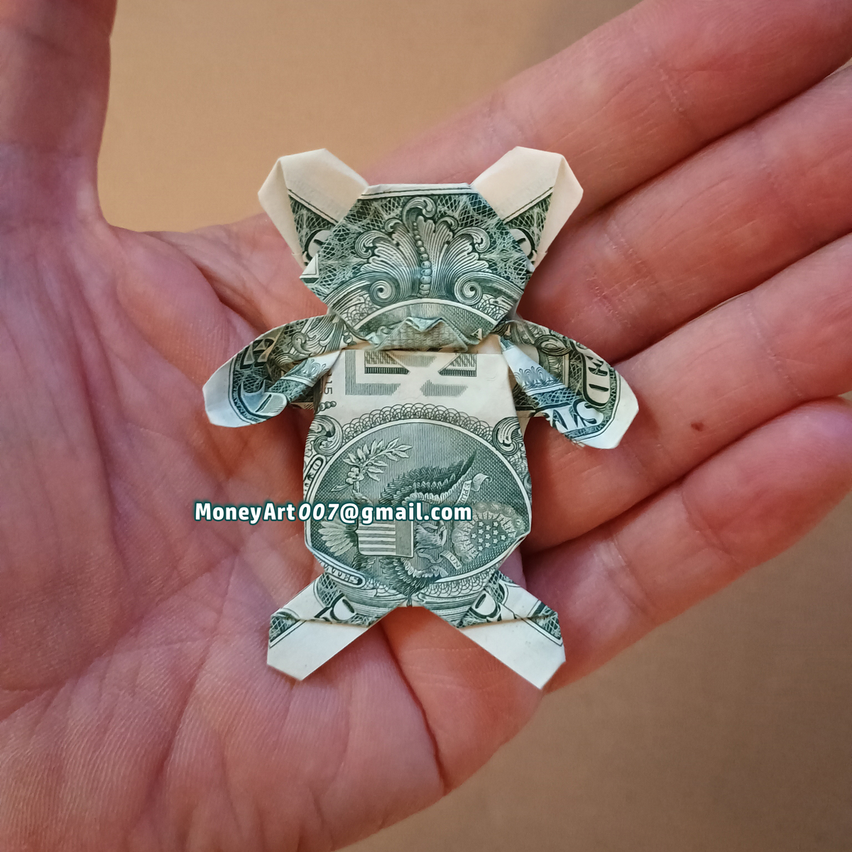 Up for sale is a beautifully crafted Origami Teddy Bear. It's folded by hand and it's made with a real $1 bill! There's no damage to the money, so you can unfold it later and spend it like real cash.