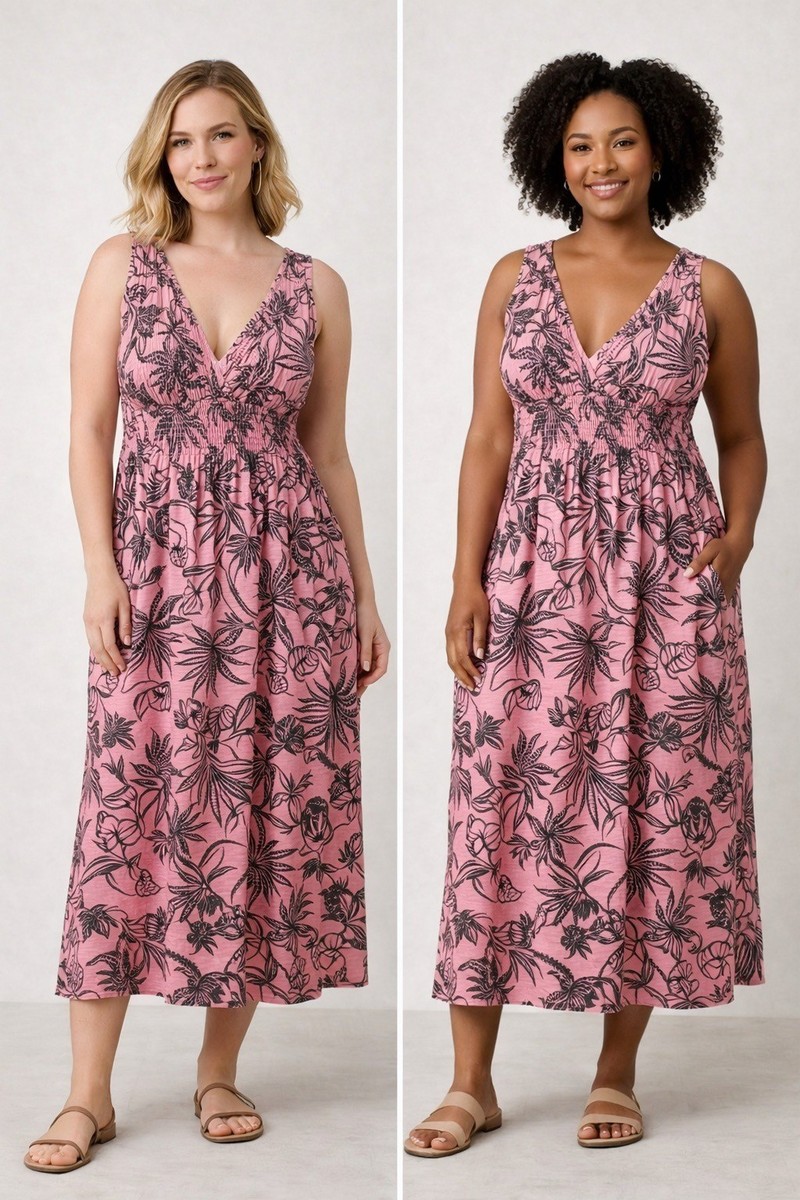Relaxed-fit sleeveless maxi dress by Tommy Bahama Relax, featuring a pink base with gray tropical foliage print. Designed with a deep V neckline, wide shoulder straps, and a smocked empire waist that provides stretch and comfort. Lightweight cotton fabric with an easy drape, making it suitable for warm weather, vacations, or casual everyday wear. Shown on model for fit and styling reference.