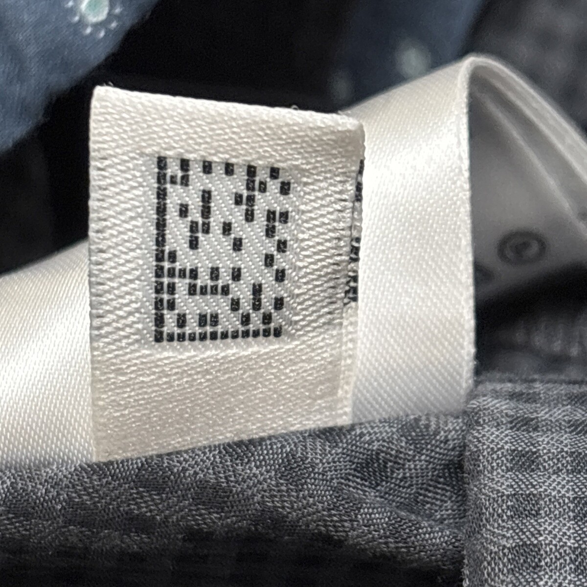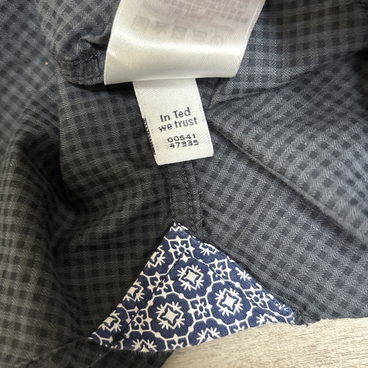 Gray and black with blue geometric pattern flip cuffs and grosgrain ribbon placket trim