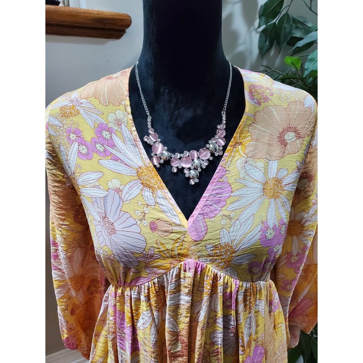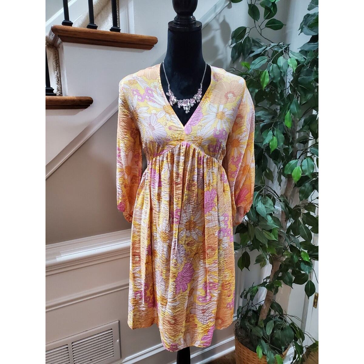 H M Women's Yellow Floral Viscose V-Neck Long Sleeve Knee Length Dress Size M.