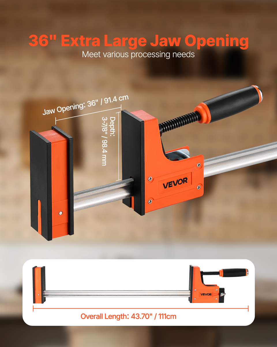36-inch Large Jaw Opening: Our bar clamps for woodworking are ideal for various standard-sized woods. The 36-inch length provides users with more adjustment space during operation, resulting in precise positioning of the workpiece