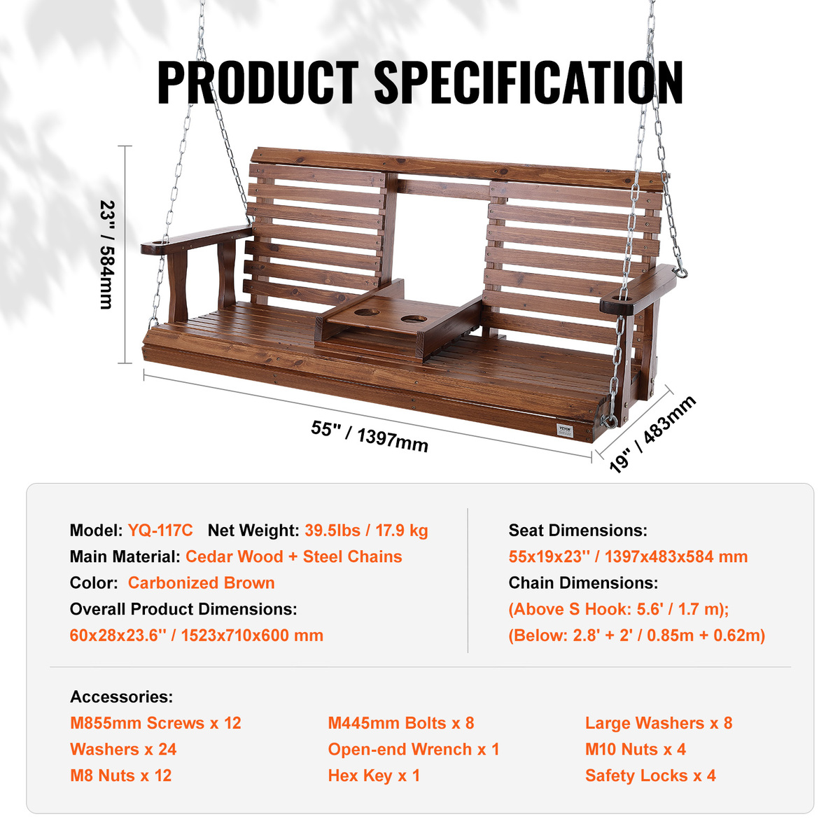 Classic Design: The timeless combination of solid wood and metal chains adds a touch of retro charm to your porch swing. Overall dimensions: 67x28x23.6''/1702x710x600 mm; seat dimensions: 55x19x23''/1397x483x584mm, comfortably accommodating 2-3 people.