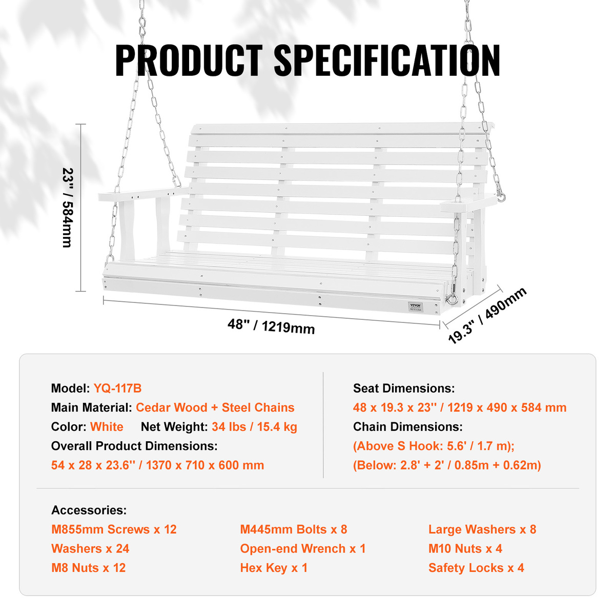 Classic Design: The timeless combination of solid wood and metal chains adds a touch of retro charm to your porch swing. Overall dimensions: 54 x 28 x 23.6'' (1370x710x600 mm); seat dimensions: 48x19.3x23'' (1219x490x584mm), comfortably accommodating 2-3 people.
