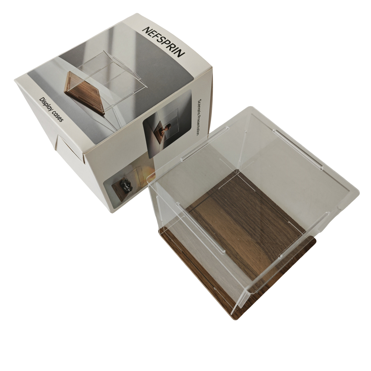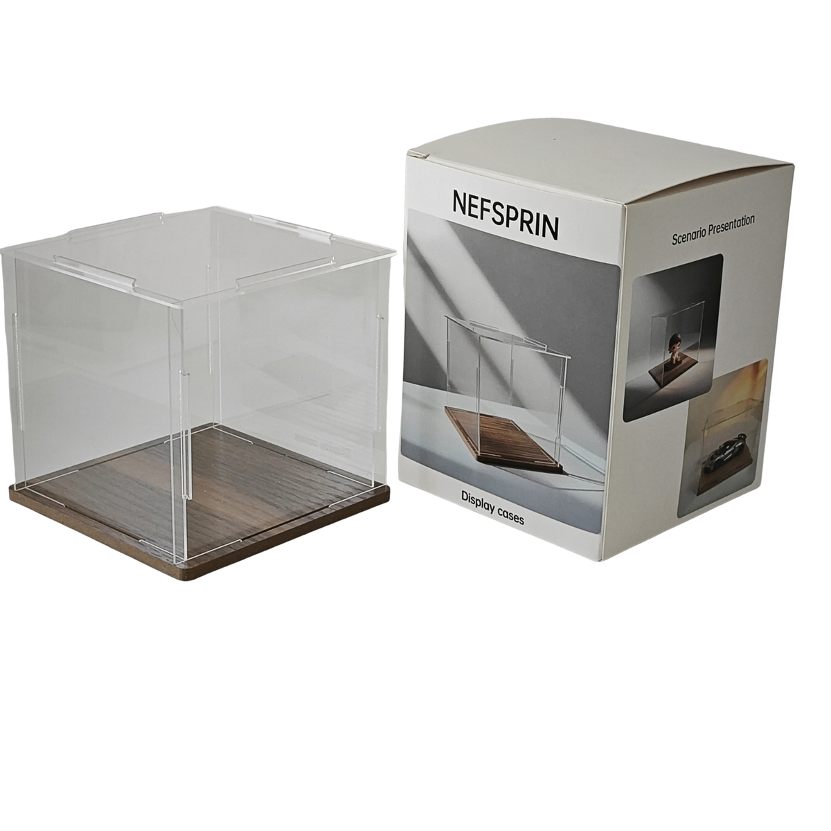 NEFSPRIN Clear Acrylic Display Case with Wood Base