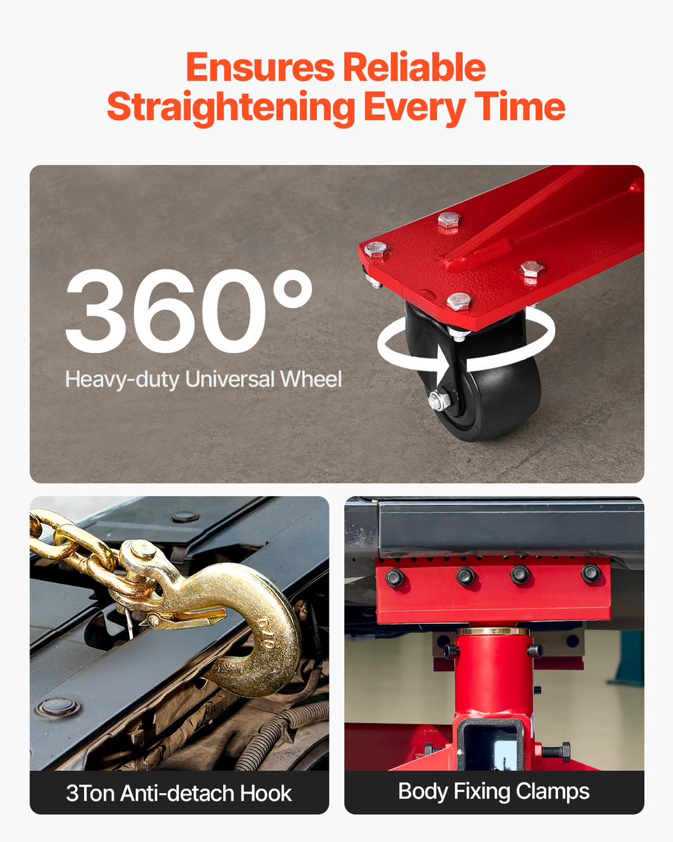 6T Powerful Pulling Force: The auto body frame puller provides 6 tons of pulling power to repair dents and deformations on accident-damaged vehicles. It also includes a 118in/3m reinforced chain and a 3-ton anti-detachment hook for added durability.