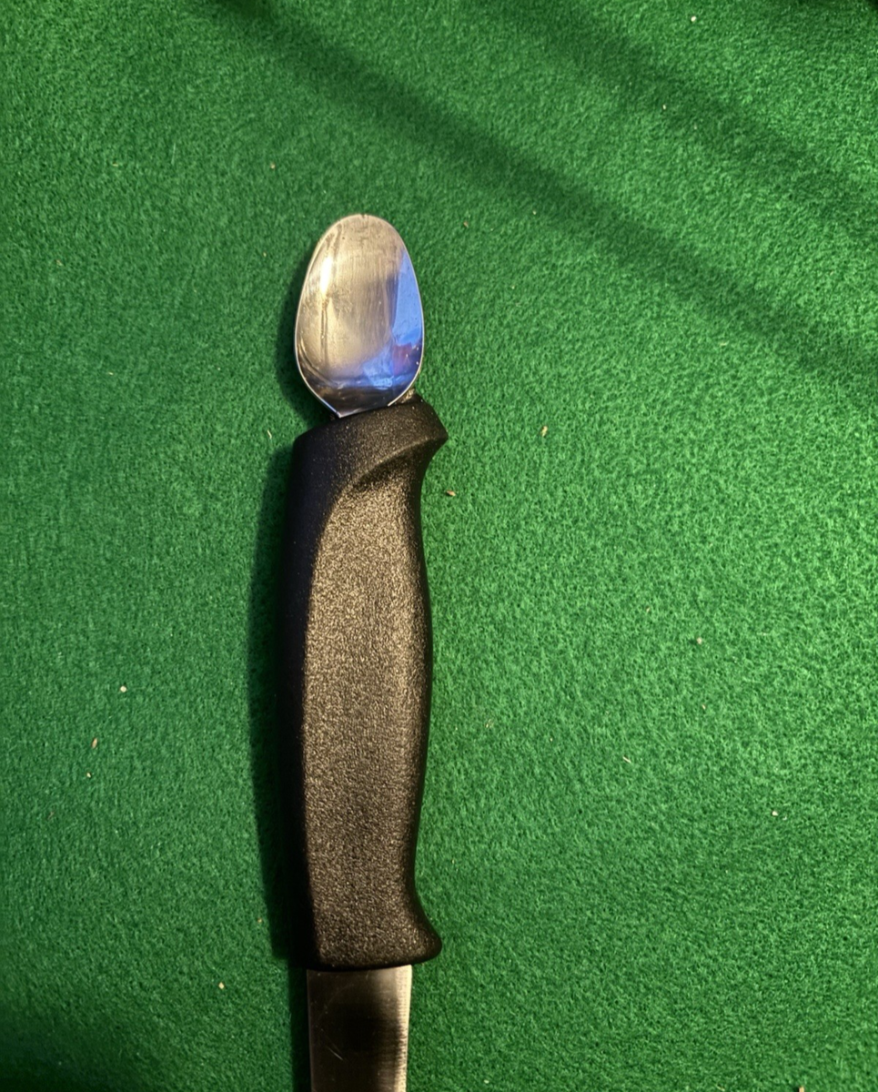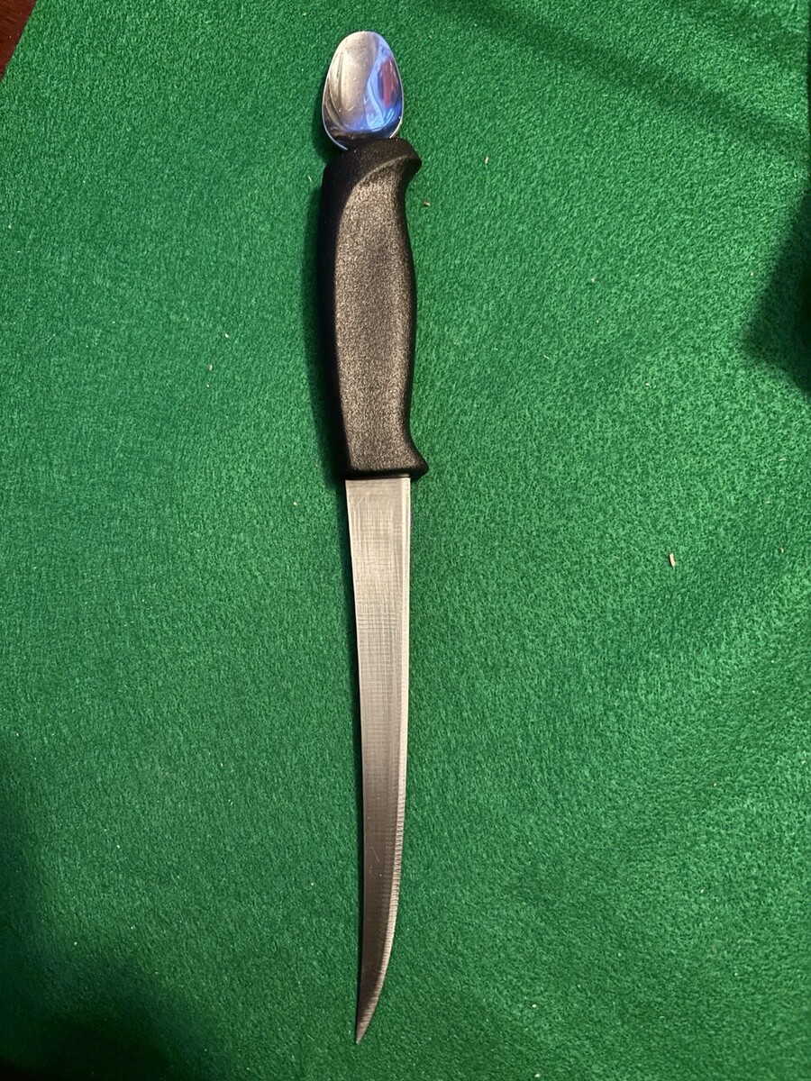 This vintage unusual knife has a spoon built into the handle for removing blood lines.
