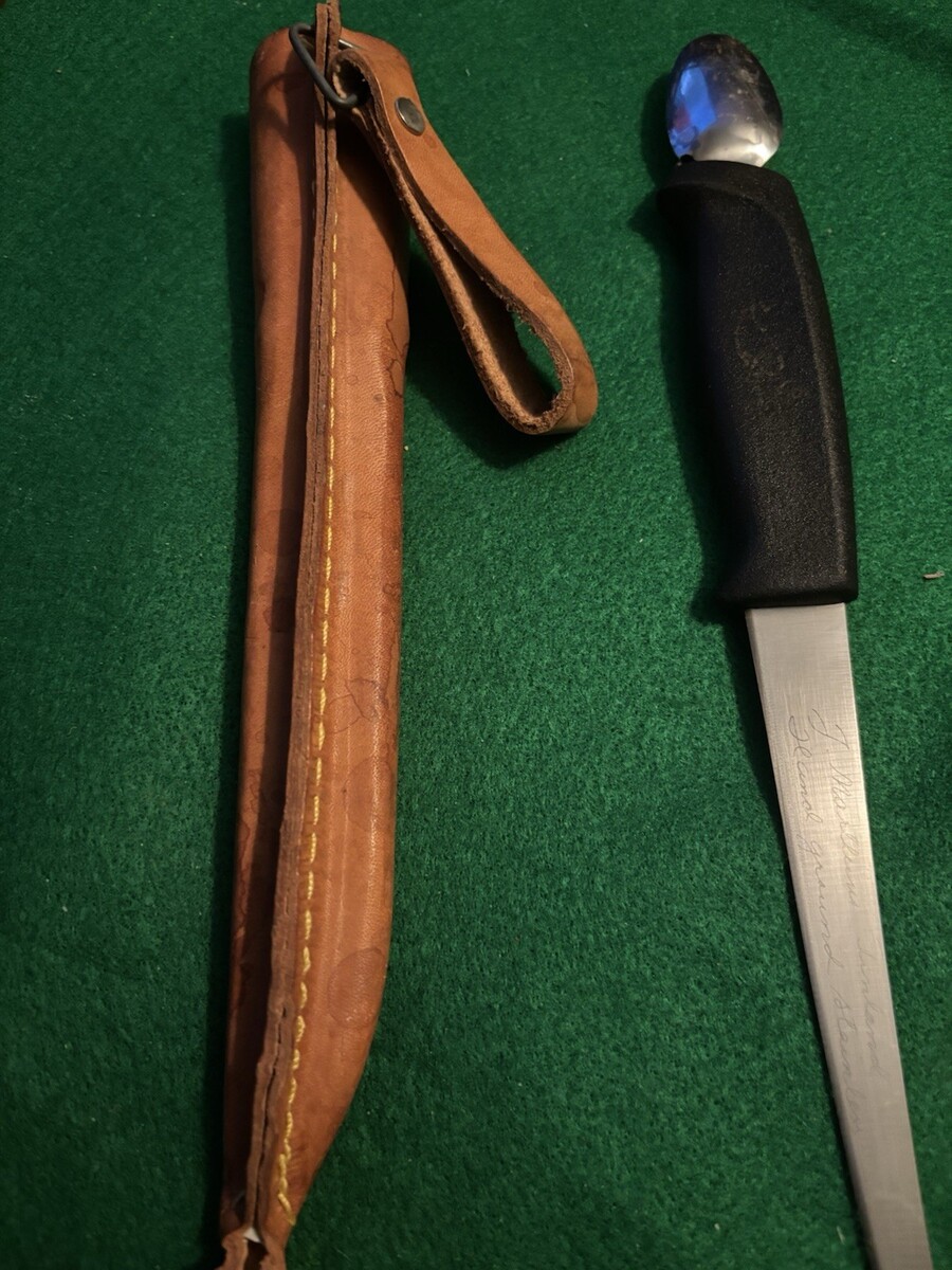 The Rapala J Marttiini Hand Ground Stainless Fixed Blade Knife with Leather Sheath is a vintage collectible knife from Finland. It features a stainless steel blade over 5 inches long with a plain edge, suitable for fishing purposes. The ambidextrous design and leather handle add to the craftsmanship and durability of the knife. This original piece comes with a sheath, making it a practical and stylish addition to any knife collection.