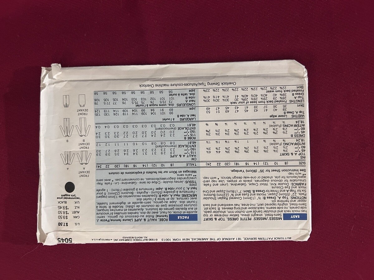 This vintage Butterick pattern 5045 from the 1990s offers a timeless design for a petite dress, top, and skirt set in sizes 8-12. Uncut and originating from the United States, this pattern is perfect for female adult and teen fashionistas looking to create their own unique wardrobe pieces with a touch of nostalgic charm. The brand's reputation for quality and attention to detail ensures a finished garment that is both stylish and well-made, making it a valuable addition to any sewing pattern collection.