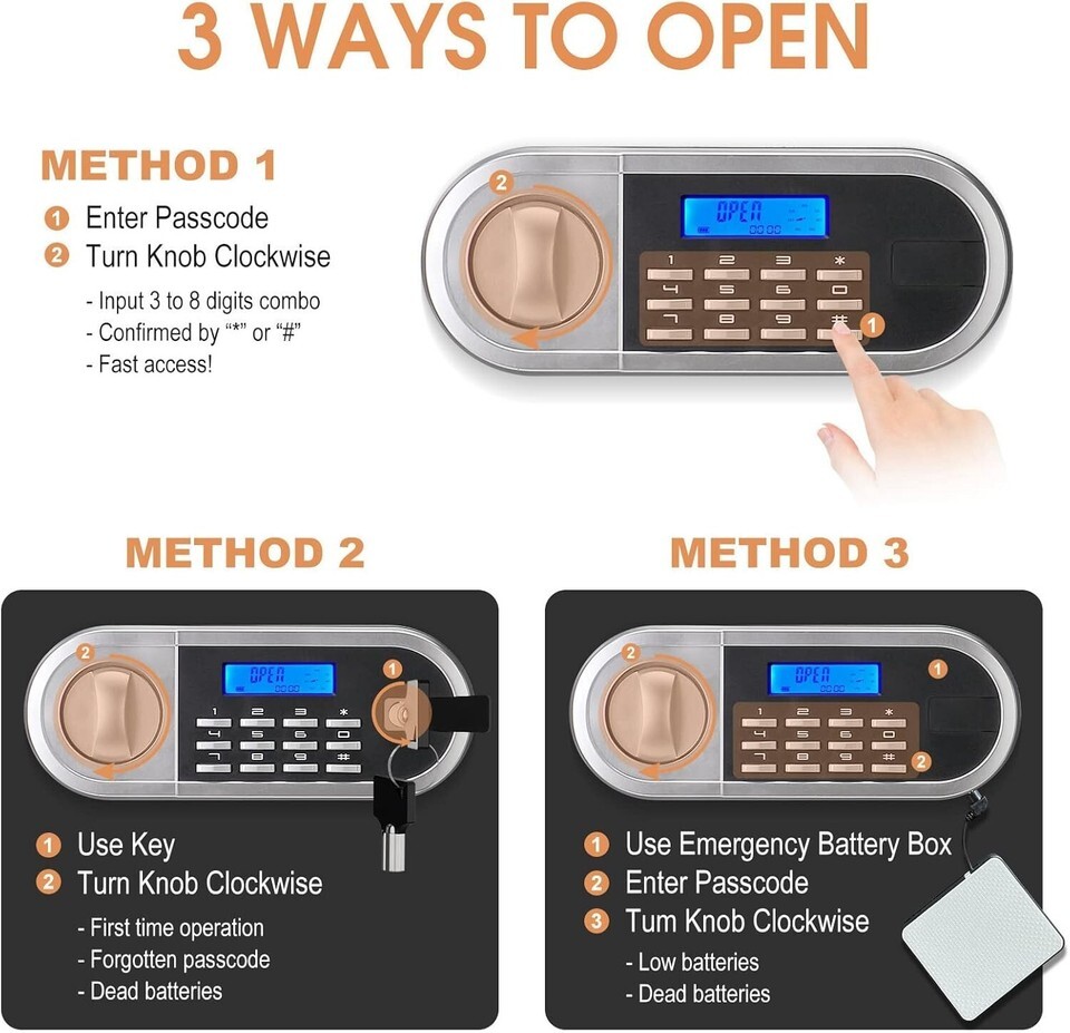 Digital Keypad Access: Easily program a numeric code to secure your safe, eliminating the hassle of traditional keys?ideal for keeping hazardous items away from children.
