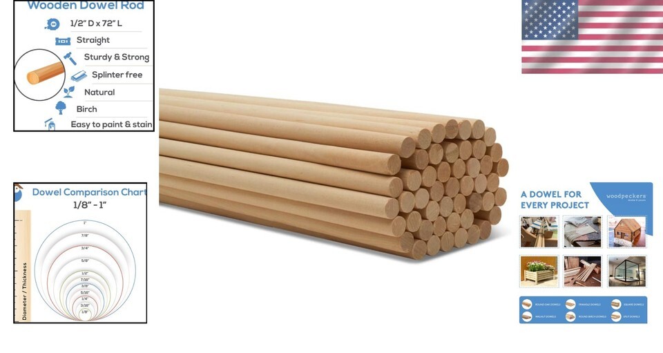 Eco-Friendly 1/2" x 72" Wooden Dowel Rods - Perfect for DIY and Crafts