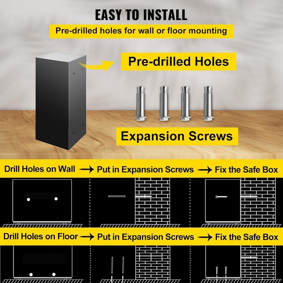 Effortless Installation: Equipped with multiple pre-drilled holes, the safe box can be securely mounted to the floor, wall, or cabinet. Operating on 4 x 1.5V AA batteries (not included), it ensures convenient accessibility.