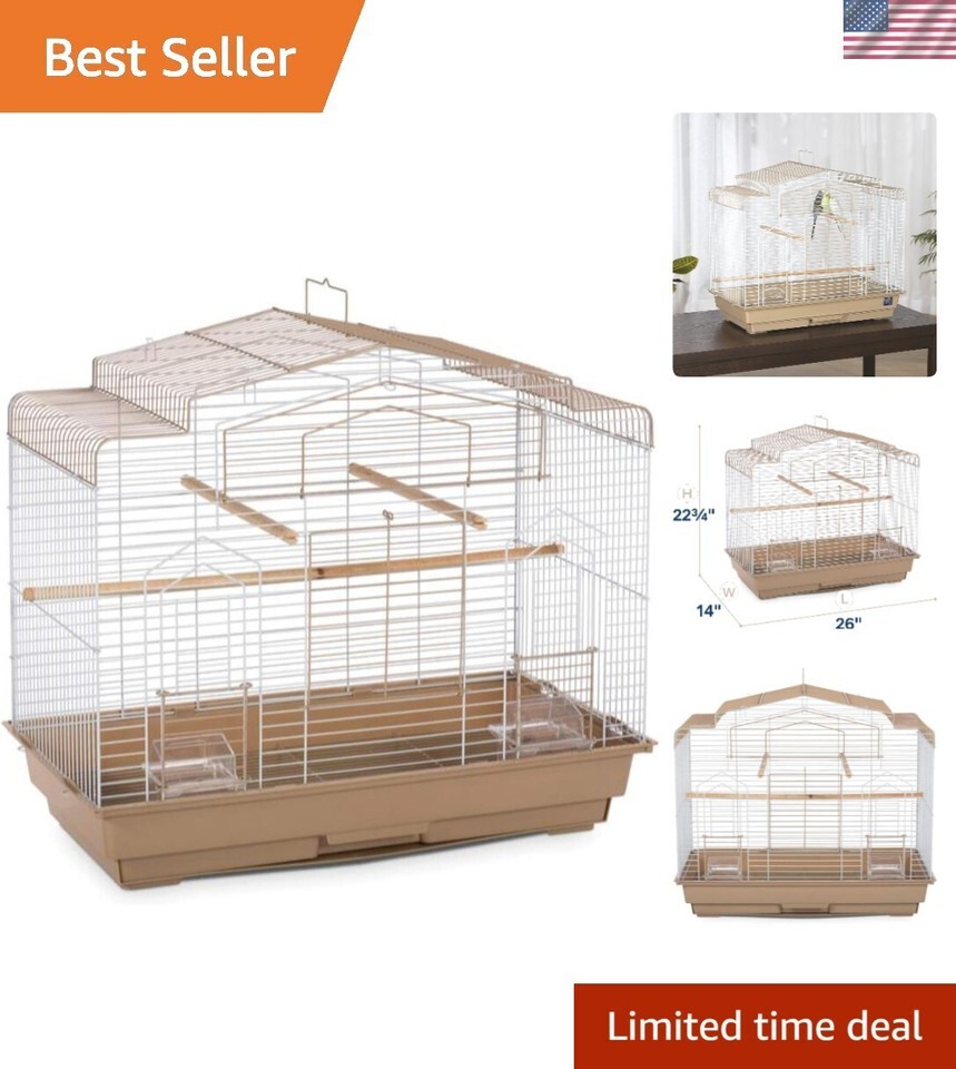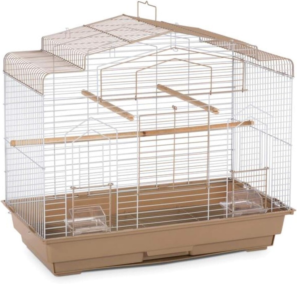 Barn style bird cage brown and White features a unique Barn style roof design. A large front opening door plus a drop down landing Perch door let you easily access your pet. A removable bottom grille and 1-Inch deep pull-out tray make cleaning your cage quick and easy. Barn style cage includes 2 outside access feed/water cups, 3 perches and is designed for parakeets, cockatiels and other small-medium birds. Available in a brown and White color combination, cage measures 26-inch L by 14-inch W by 23 1/2-inch H with 1/2-inch wire spacing.