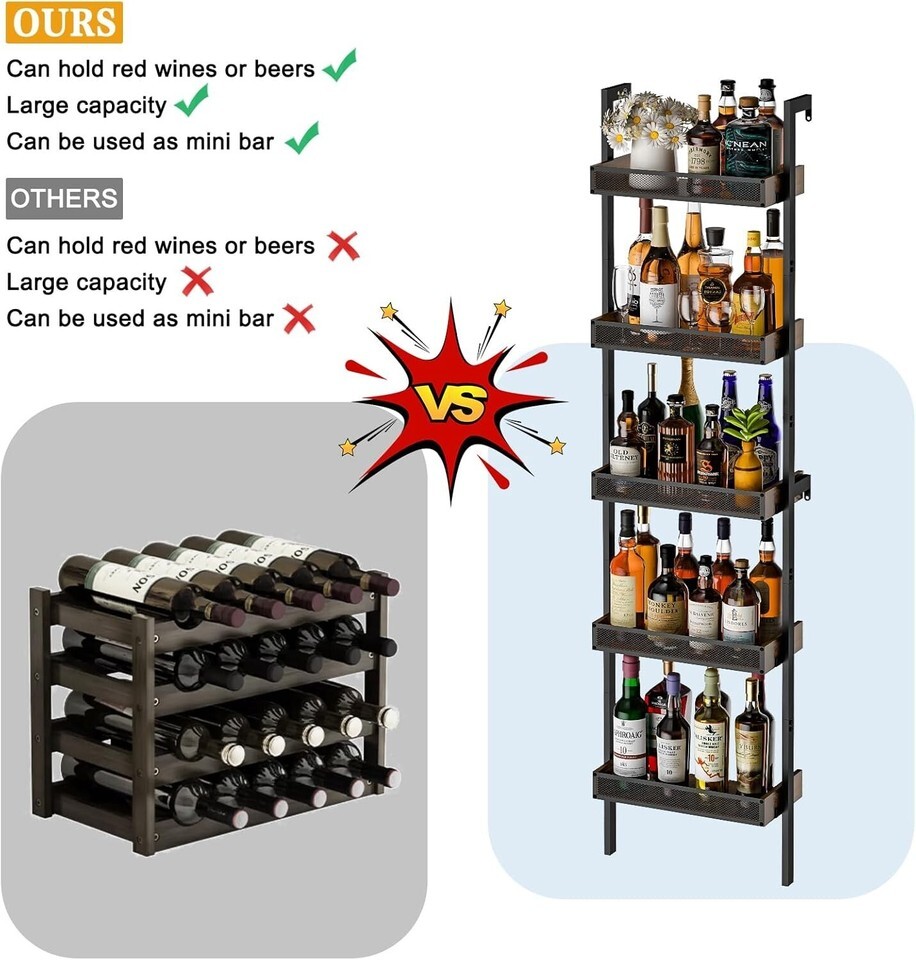 This sturdy 5-tier wine rack not only maximizes your space but also features a significant storage capacity that can hold up to 50 bottles - a true haven for any wine aficionado. Whether you prefer a freestanding model or a wall-mounted option, our versatile rack elevates your wine storage experience while keeping your favorite vintages secure. Invest in your passion today and transform your home into a luxurious oasis for wine enjoyment.