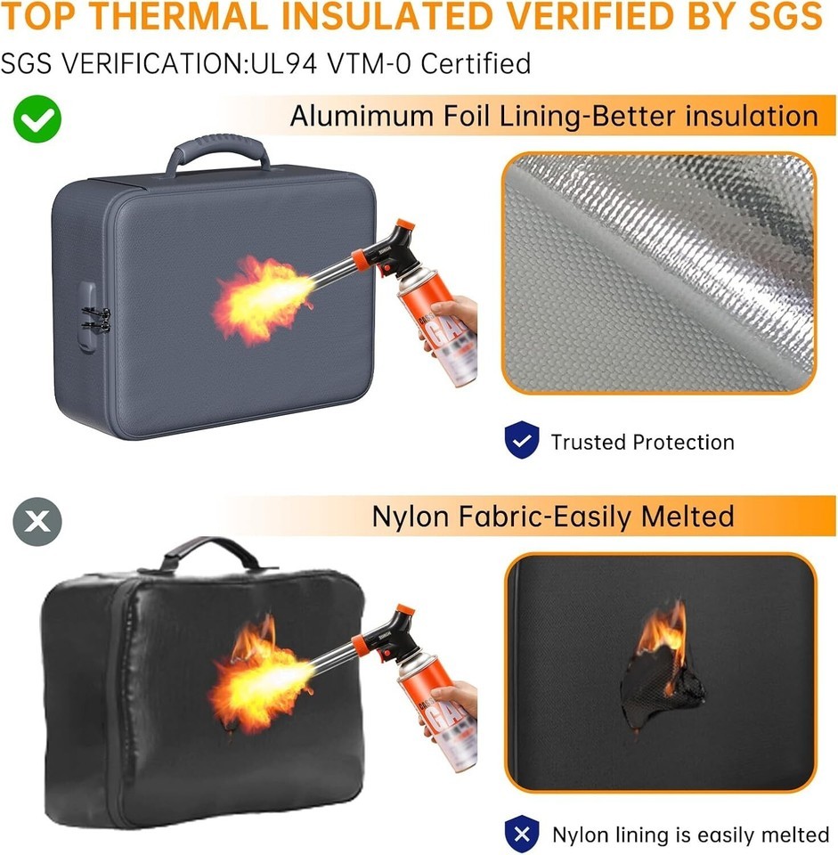 5200F Fireproof ? Water-resistant safe: The Upgraded important document organizer is made of thickened silicone coated fireproof cotton material and aluminum foil which withstand the temperature up to 5200?(double safe protection). Aluminum foil lining isn?t easily melt under high temperature after several tests. It has been passed by SGS TEST(UL94 VTM-0 Certified).The bag is fireproof?Water-resistant, which can effectively protect your important documents in a fire, flood, and wet weather