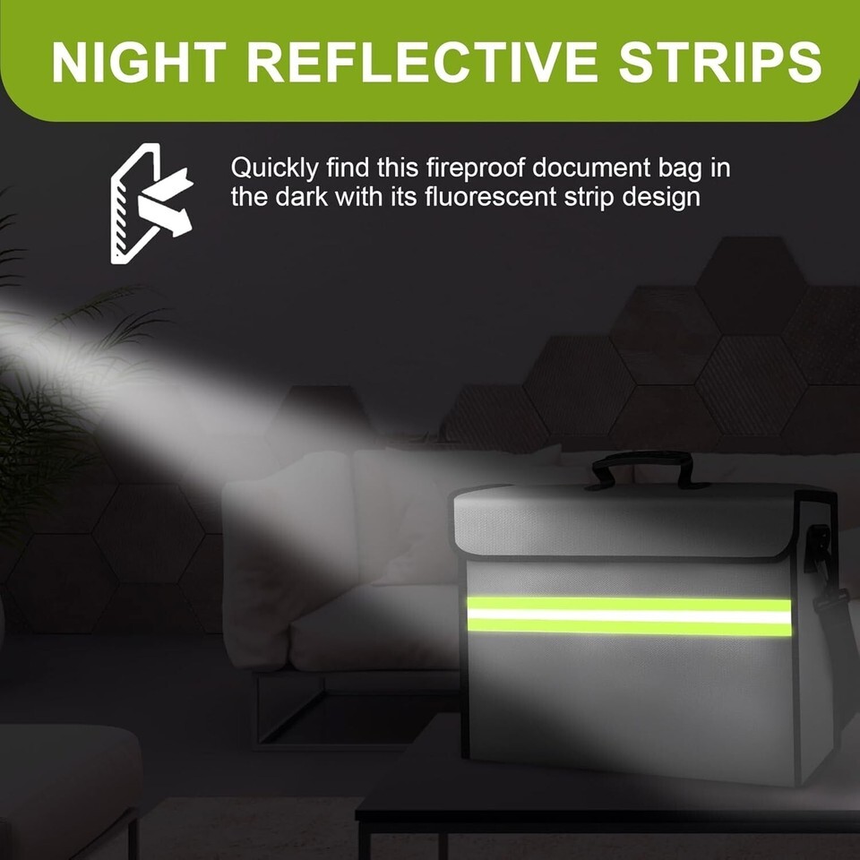??360 Fireproof and Waterproof Design?This Fireproof Money Bags is sewn with flame retardant thread and fireproof edges to prevent flames from damaging the fireproof bag from the edges, and it has a unique double-sided two-color reflective strip, allowing you to find it clearly in the dark. The sealed waterproof zipper, combined with the Velcro flap design, can withstand the high-speed spray of the fire hose and prevent fire, heat, and smoke from entering the fireproof bag.