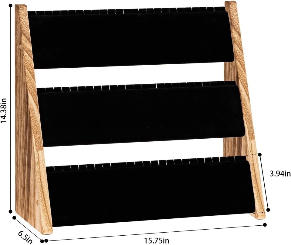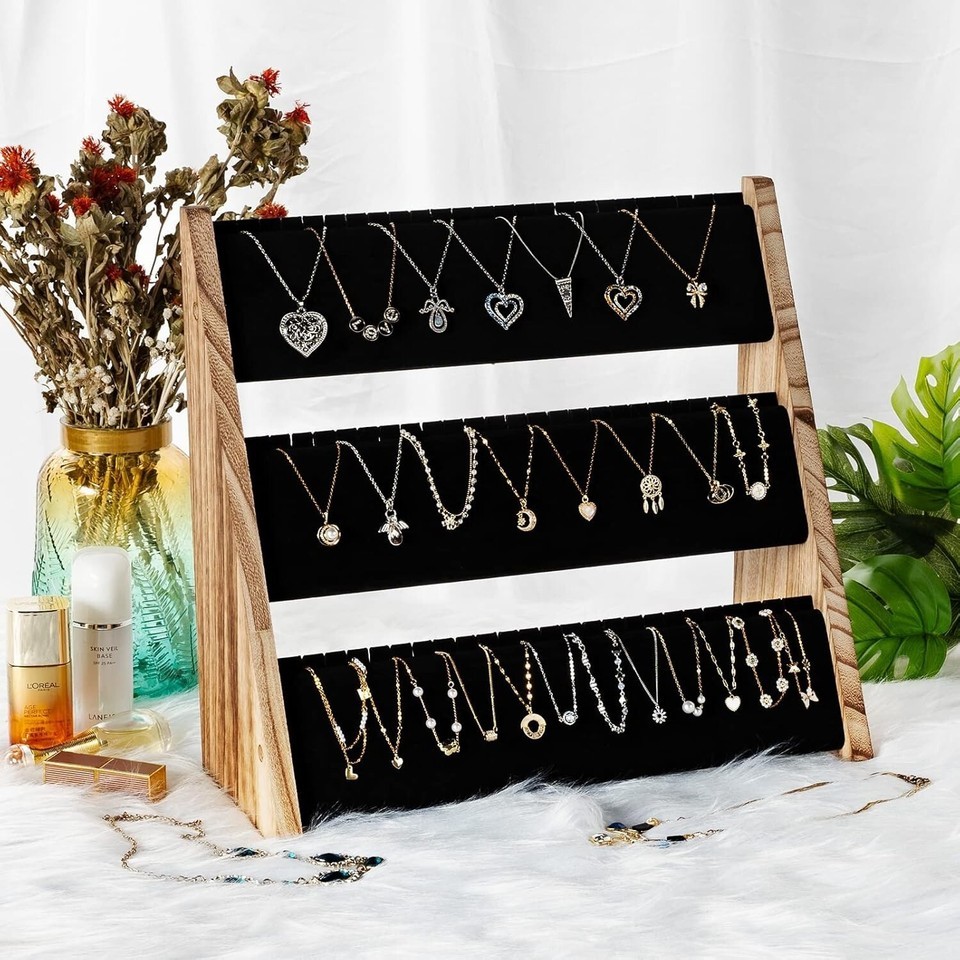 Wooden - Black Velvet Necklace Organizer Jewelry Organizer for Displaying NecklacesNo need to worry about losing your necklaces anymoreNo more worrying about tangled necklacesNo more worrying about how to display your elegant necklacesLarge Capacity 3-Tier Rustic Necklace Holder Display Stand for Hanging Necklaces You can hang up to 72 necklaces as you like in the 72 necklace slots in elegant manner on this wood necklace display and get the necklaces organized! The soft black velvet will protect your necklaces from chafing and your necklaces will stand out against the black velvet. s for Selling If you are planning for your vendor show or jewelry business, then this wooden jewelry display stand will be an important part of your success, the simple assembly and elegant design will make your necklaces more appealing!