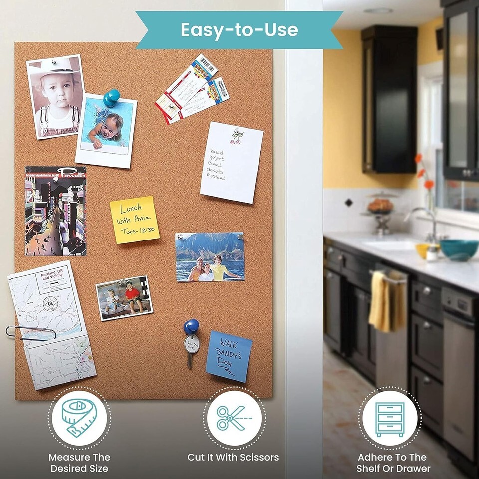 Organize and create anything with product's self-adhesive cork roll, a versatile liner that not only provides endless project possibilities but also allows you to cover and protect your drawers, cabinets, or shelves. Made with natural cork, our premium corkboard roll is designed keeping environmental sustainability in mind. With this cork roll, you can create bulletin boards, science projects, photo boards, door signs, coasters, wall decor, and even door mats! Suitable for home, office, and school, the cork shelf liner can be used inside drawers to keep your tools or other items in place and secure. For your potted plants, you can easily use our adhesive cork roll as a trivet because of its moisture-resistant quality. Also, this drawer liner absorbs sound and naturally resists mold and mildew. Our high-quality cork roll is easy to work with; all you have to do is measure the desired width, cut, and place the cork board wherever you want to.