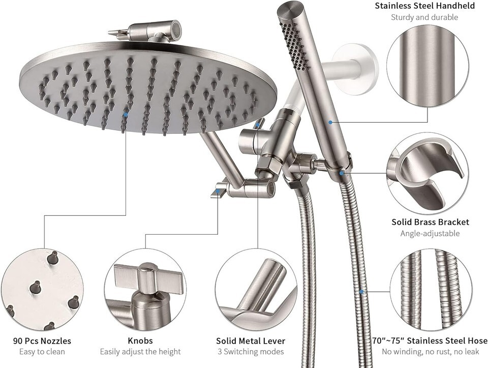 All Metal Dual Shower Head Combo | 8" Rainfall Shower Head, Handheld Shower Wand | Smooth 3-way Diverter | with Adjustable Extender - An Upgrade of Shower ExperienceBrushed Nickel