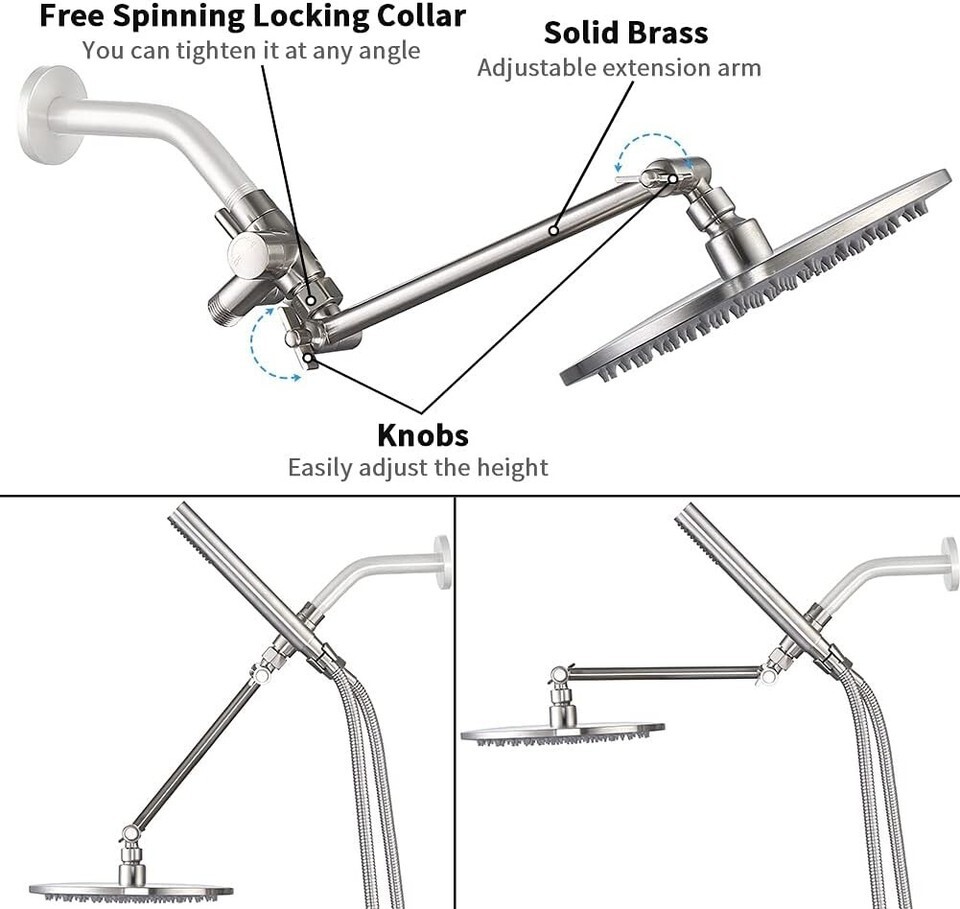 ?9-INCH SHOWER EXTENSION ARM: Keep the shower head away from the wall. You can adjust the height, distance and angle with two knobs to meet your specific needs. The free spinning locking collar allows you to tighten the extender in a correct position