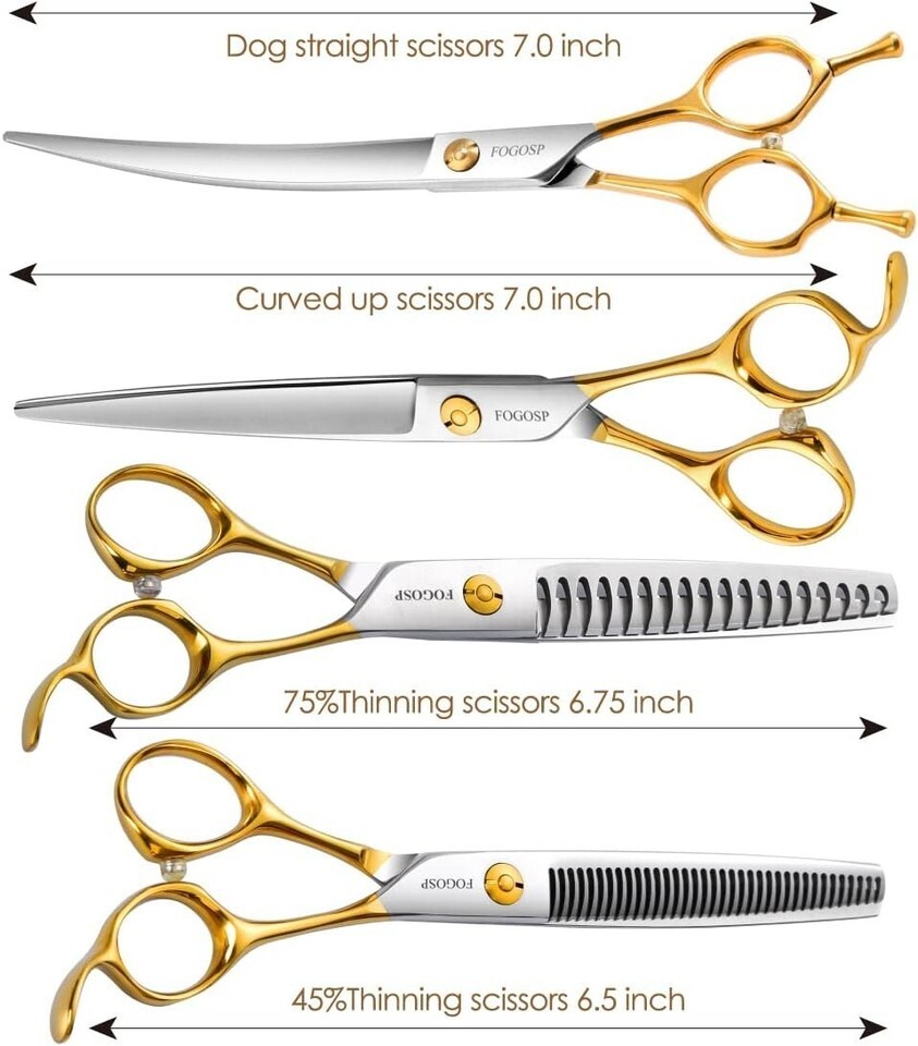 ?All in One Dog Grooming Scissors Set: The dog grooming scissors kit includes -7" upward curved grooming scissors + 7" straight cutting scissor + " thinning shears (blender shears) + " chunker shears . The curved dog grooming scissors is great for trimming around head, ear, eyes, fluffy legs and paws. The thinning shears is to thinning the thick hair animals. The straight scissors is to cut long hair and fur on body, these grooming shears will cover your basic everyday grooming needs.