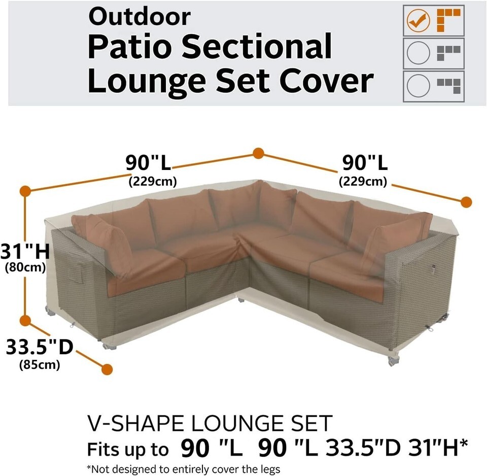 Decent Size --- 90" (90") " x 31", Fits V-shaped Patio Sectional Sofa. Worry about the size? Please roll down and download Specification which will show you how to measure your sofa
