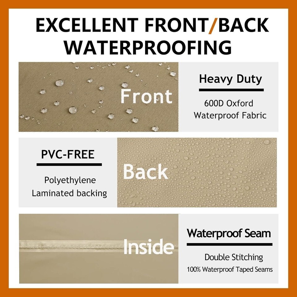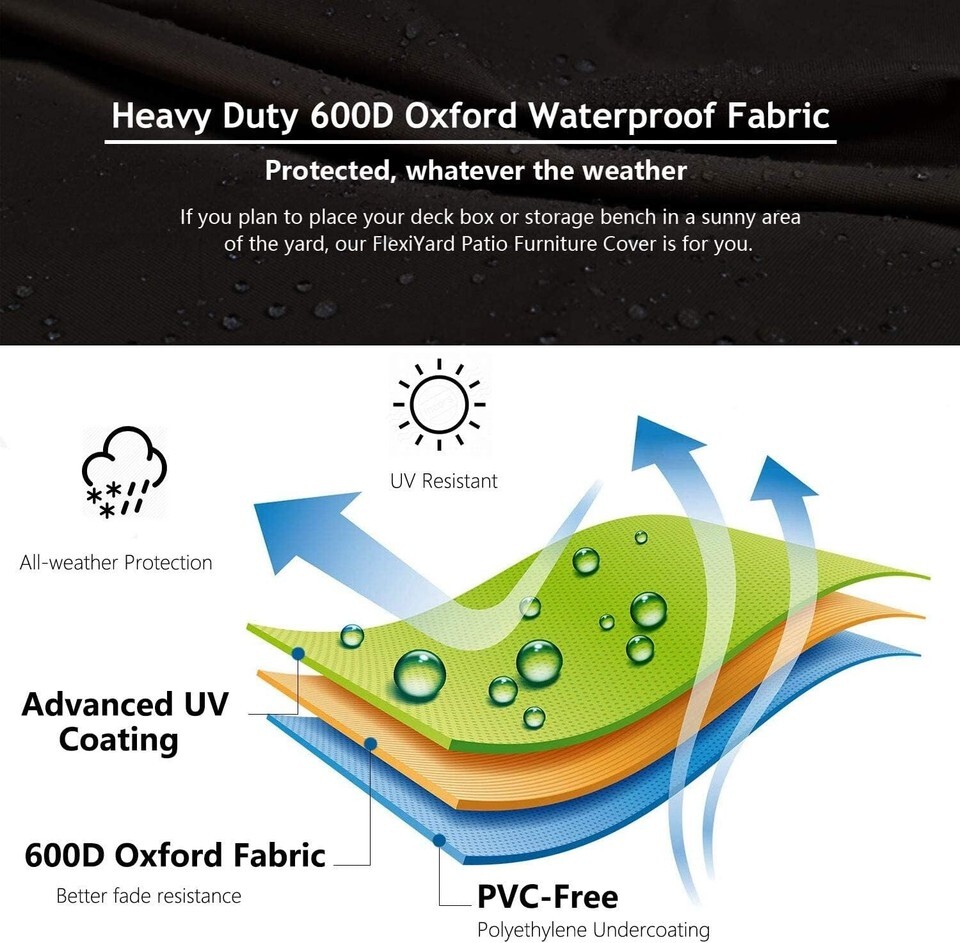 High Durability and Well Designed --- Made of heavy-duty 600D Oxford fabric that can support weather-resistant, water-resistant fade Resistance, and rip-resistant. With an added UV-stabilized coating and a PVC-FREE water-resistant laminated backing, the cover builds to last through all seasons. Come with an extra round of material to use as a patch
