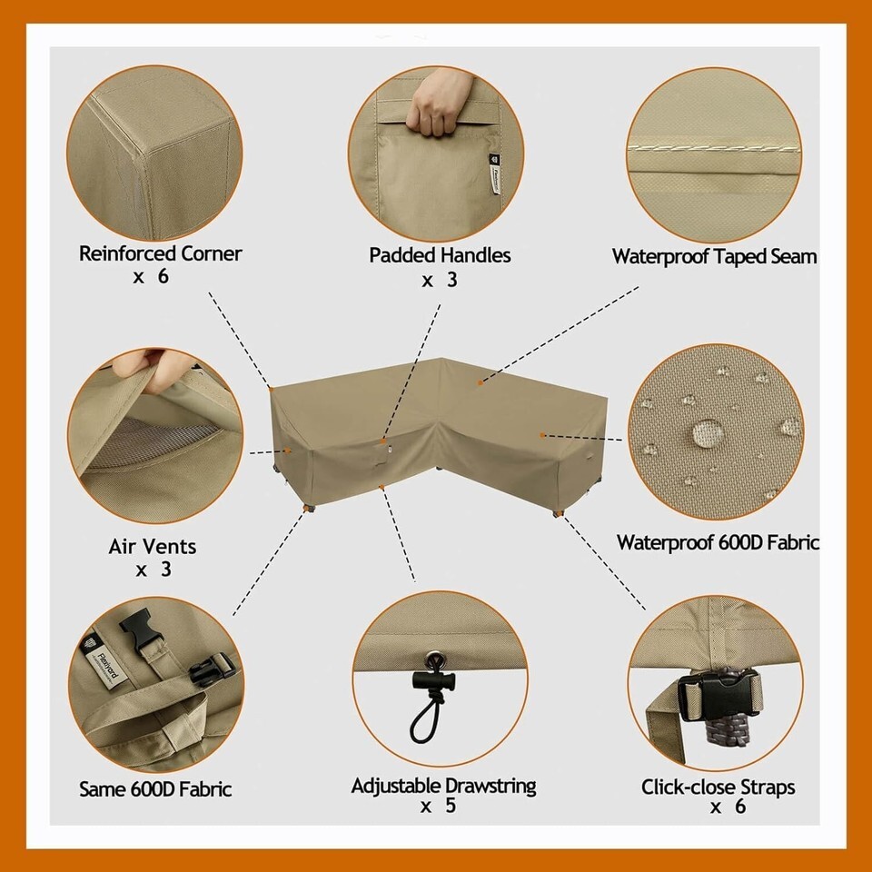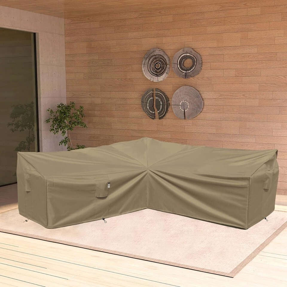 Heavy Duty Outdoor Sectional Sofa Cover, Waterproof 600D Patio Sectional Couch Cover, Lawn Patio Furniture Cover Desert Khaki, V-Shaped-90 x 90"