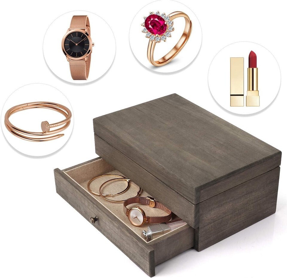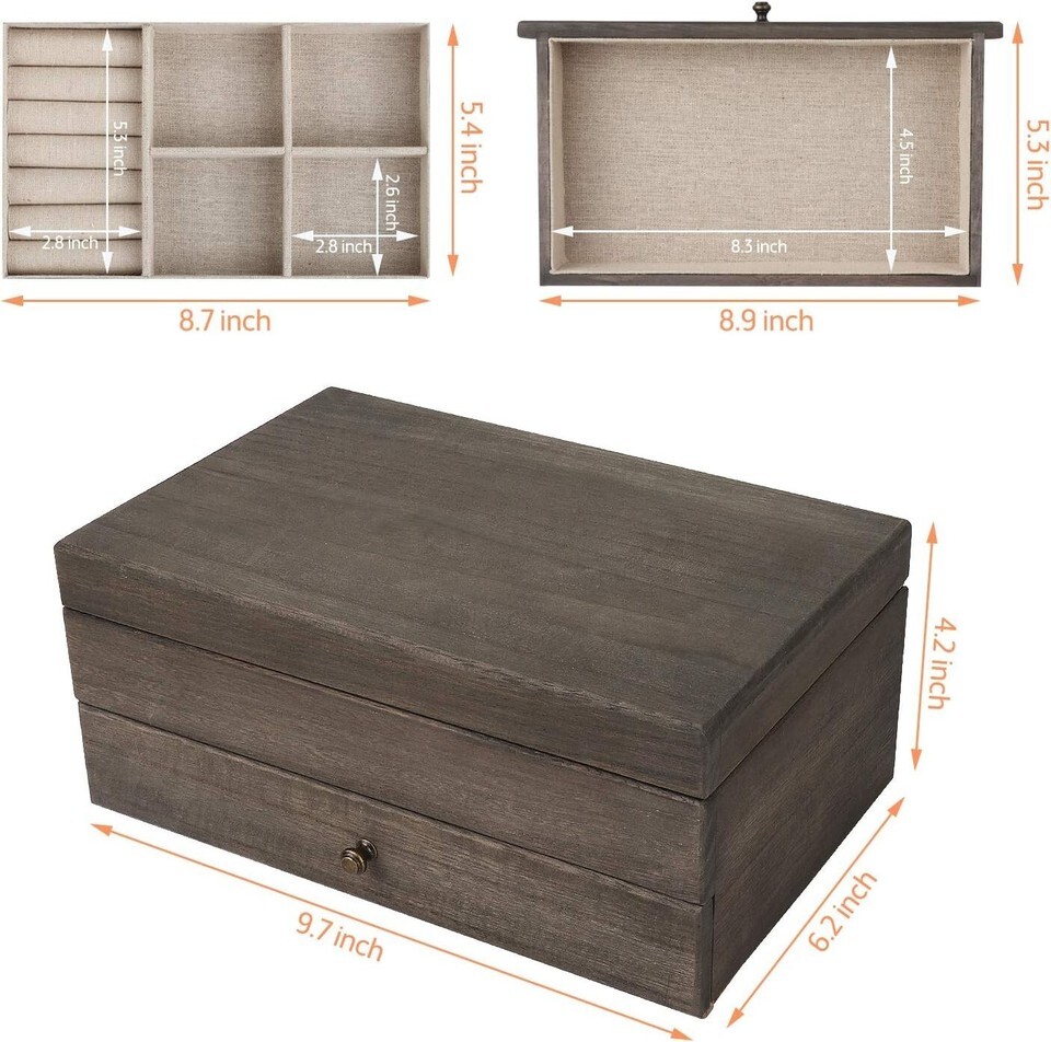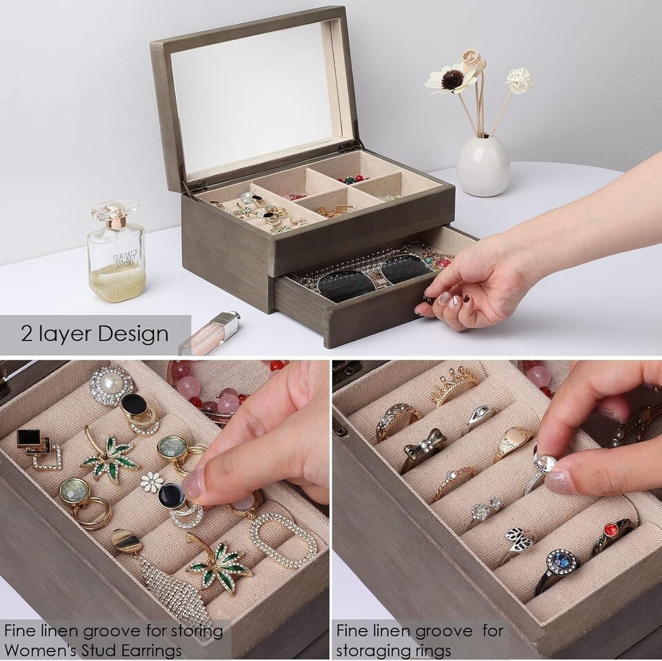 ?CLASSIC JEWELRY BOX: Jewelry organizer box is made of solid wood and finish with weathered grey into a rustic style, sturdy and durable to stand heavy jewelry cosmetics. Linen cloth-covered inside keeps your jewelry well against dust, scratches, damages. Metal delicate handle highlights retro beauty. Any detail is specially designed for organizing jewelry.