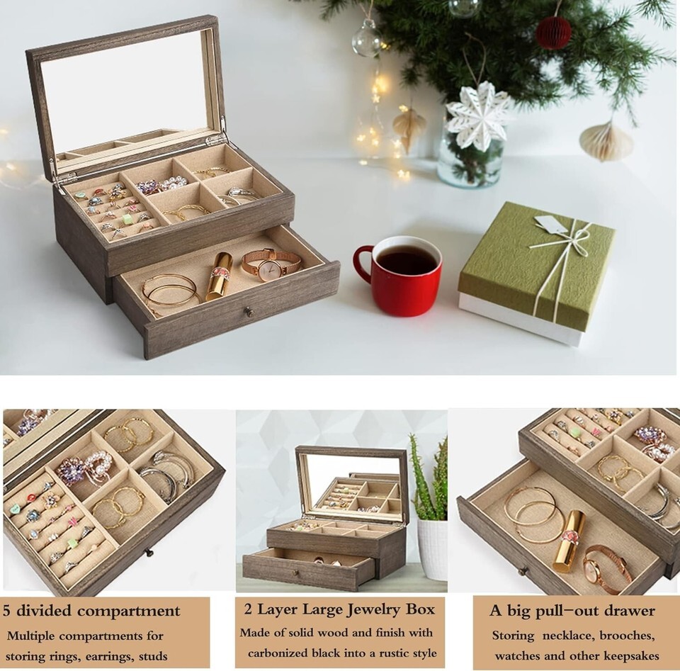 Jewelry Box Organizer for Women, 2 Layer Large Jewelry Storage Case, Rustic W...