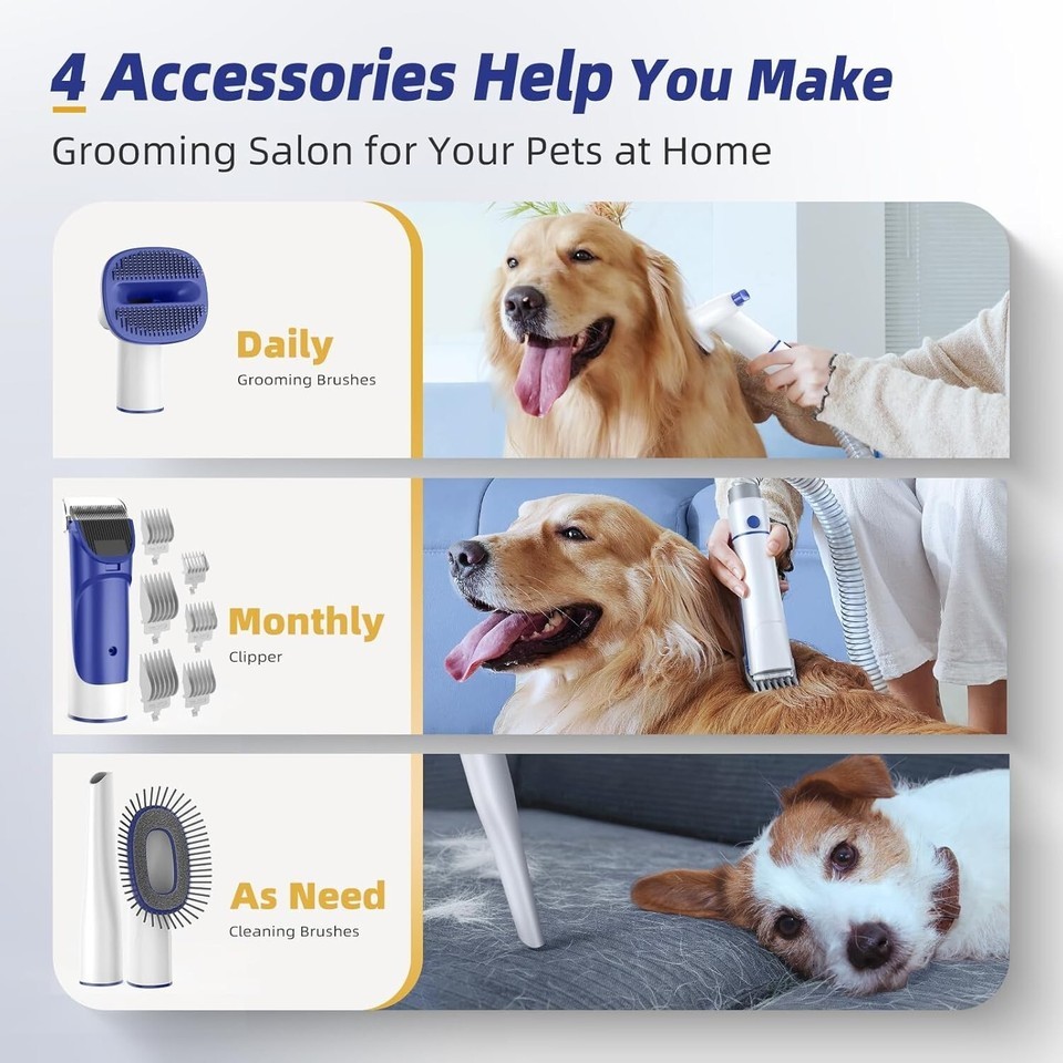 ??Professional Pet Salon at Home? dog grooming kit includes 4 attachments: grooming brush deshedding tool to remove loose and tangled hair; dog grooming clippers for haircut; cleaning brush and nozzle to clean the work area. This grooming kit saves time and cost of visiting a groomer, which can pay for itself quickly.