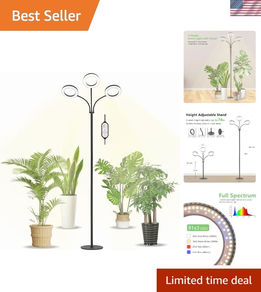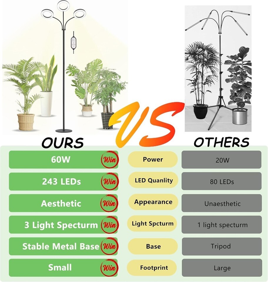 ?Upgraded 3 Heads Grow Light?This 60W grow light with 3 light heads make it cover a more extensive lighting area for your plants to help them grow happier. With 3 flexible 360 goosenecks and a 20-74in height adjustable premium metal stand, the plant lamp is stable and convenient to be adjusted to different lighting positions for all kinds of plants' need. Additionally, with the minimalist style, this grow light can be a decorative light in your home or greenhouse