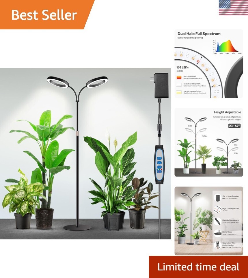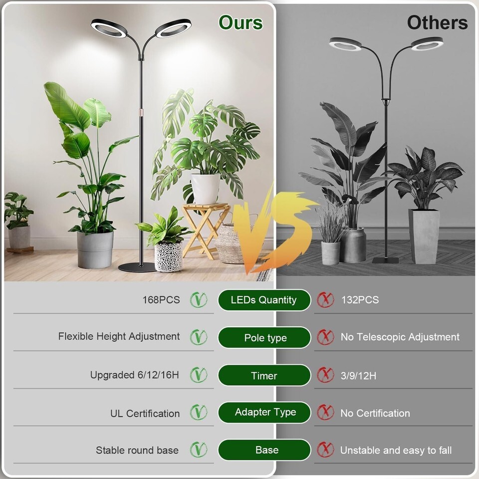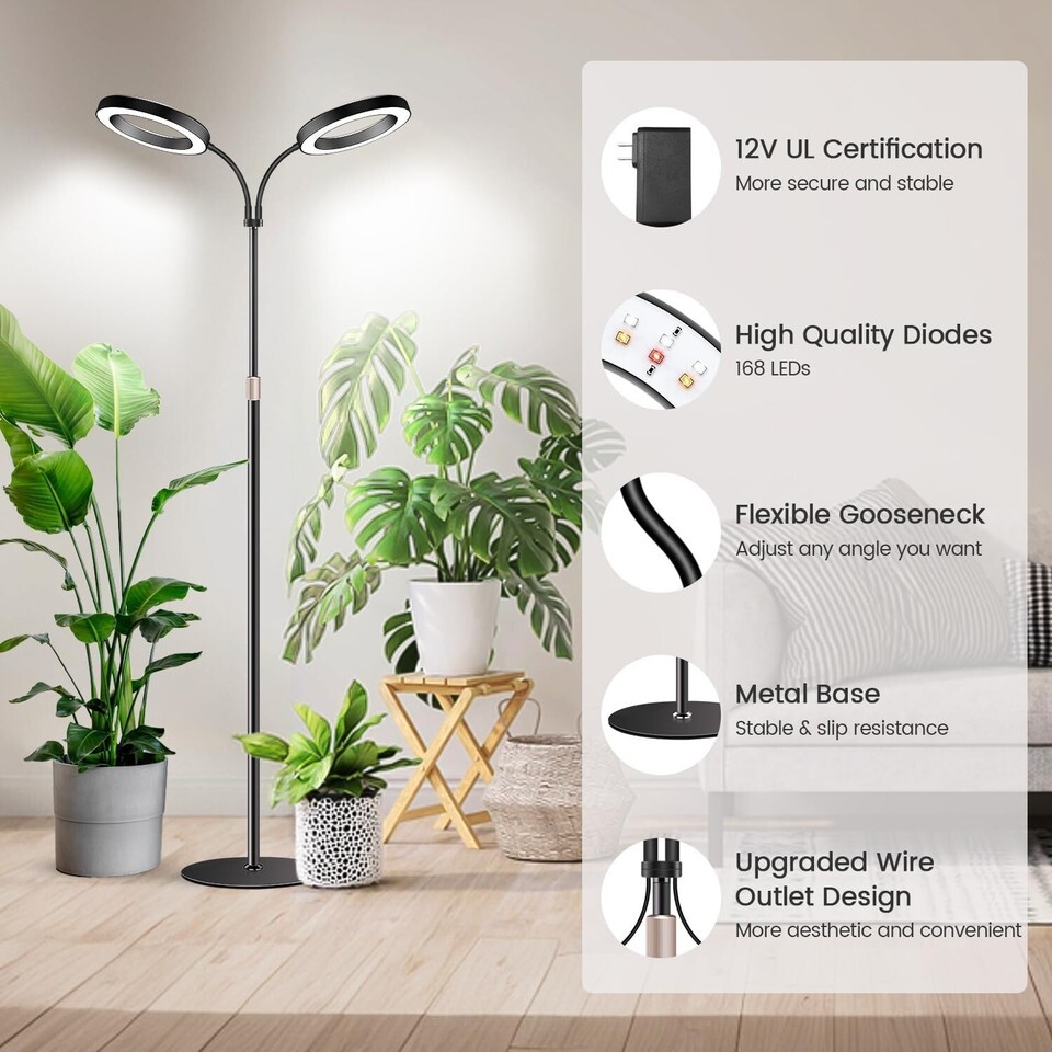 [Brighter Apply to Large Plants]: This Dual-Head grow light is equipped with 168 LEDs and has been upgraded with a translucent ring shade for increased light transmission. The base features a sturdy metal base with cotton pads for stability and slip resistance. The gooseneck tube and telescopic pole give you the freedom to adjust the angle and height you need, with height adjustments from 23 to 67 inches for a variety of large plants