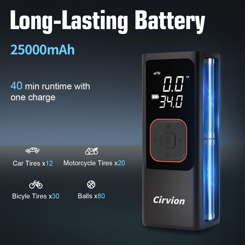 POWERFUL 25000mAh BATTERY: Inflate up to 12 tires on a single charge, with an added cigarette lighter adapter for emergencies