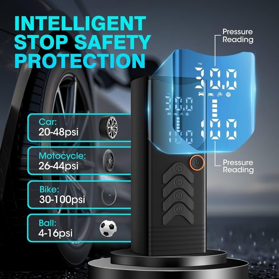 Versatile measurement unit air pump: This air pump provides four different measurement units (psi, kpa, bar, kg/cm), which can easily and accurately monitor the pressure and adjust it according to the requirements of various vehicles and sports equipment. When the required pressure is reached, the air compressor will automatically stop, ensuring safe inflation every time.