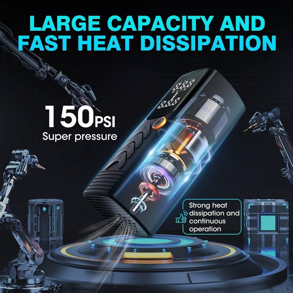 Powerful Iportable air compressor: Our portable tire inflator adopts advanced one-button inflation design, and the high-speed motor has a maximum output pressure of up to 150psi, which can ensure fast and safe inflation to meet all your needs, whether it is a car, truck, motorcycle or bicycle. Far more than traditional inflators.