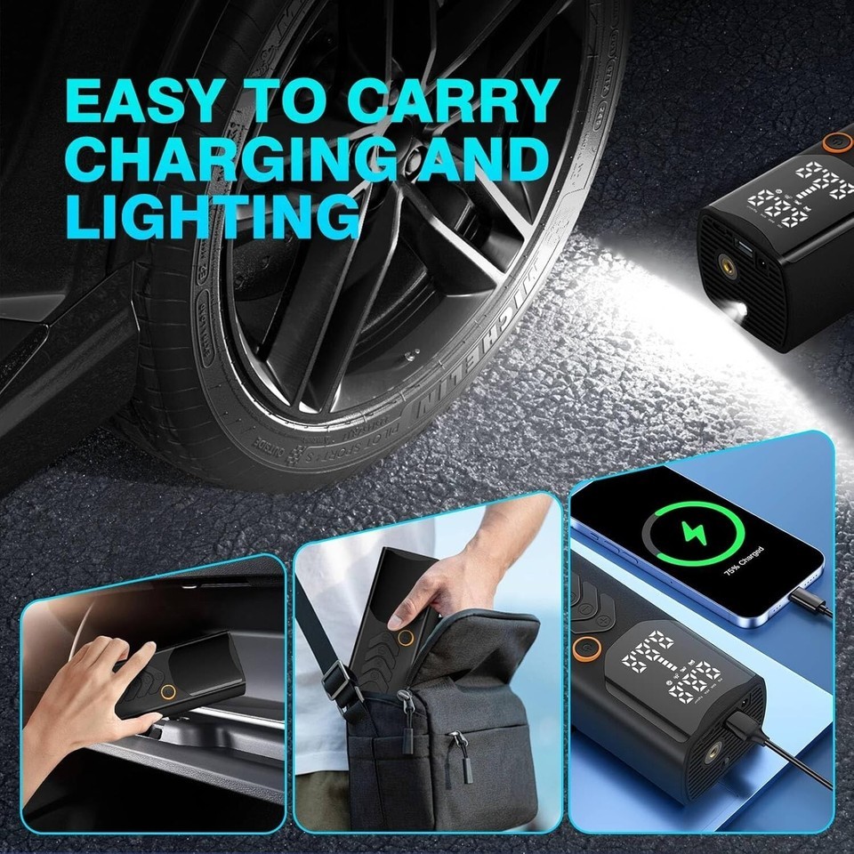 Built-in LED light tire inflator: The built-in LED light is perfect for night use, providing visibility when inflating tires or other items in low light conditions, ensuring safety in emergencies.