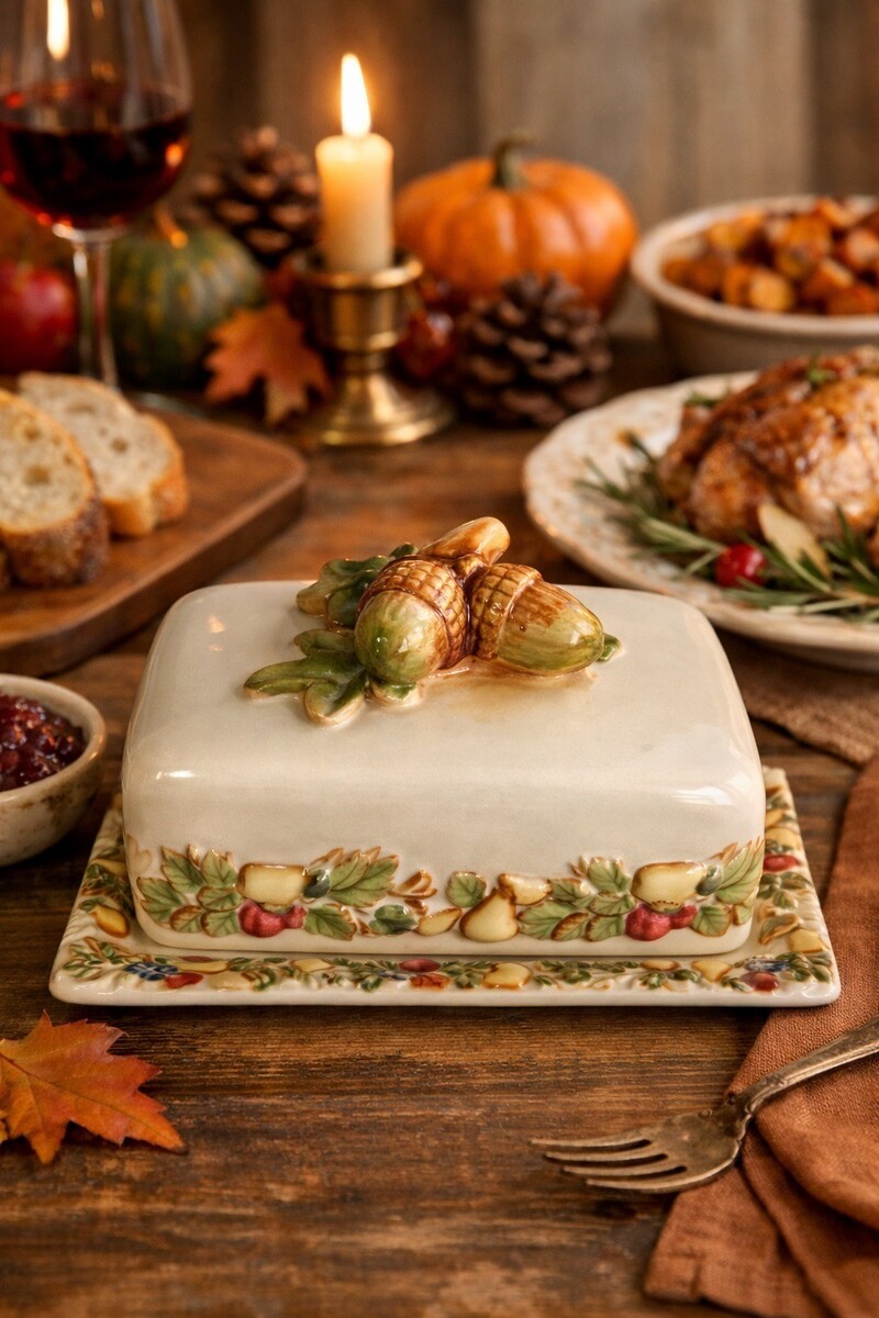 Vintage Autumn Ceramic Butter Dish with Acorn and Oak Leaf Lid