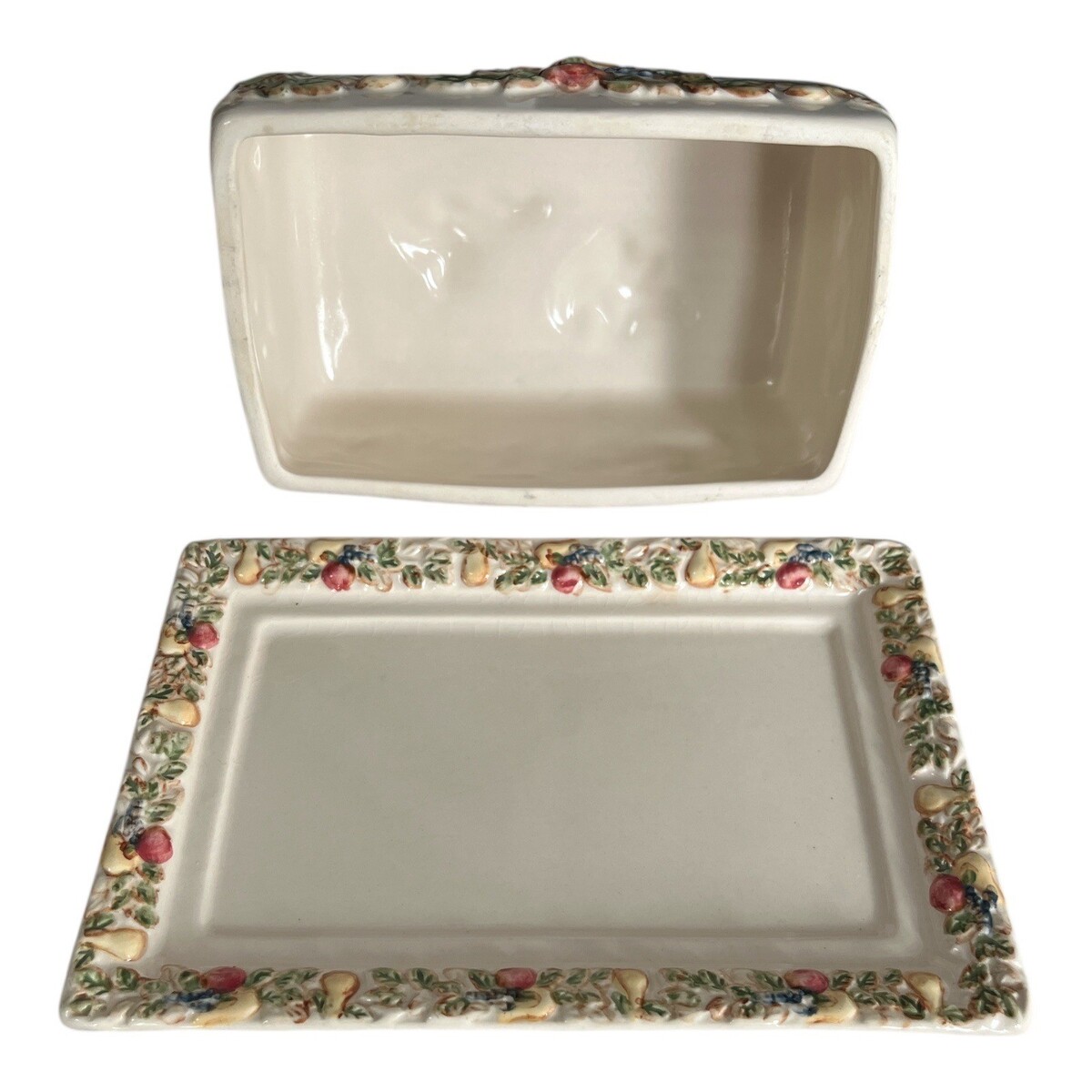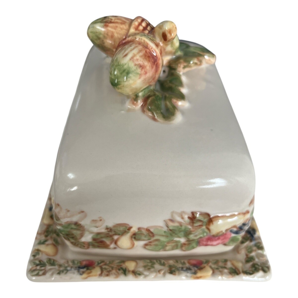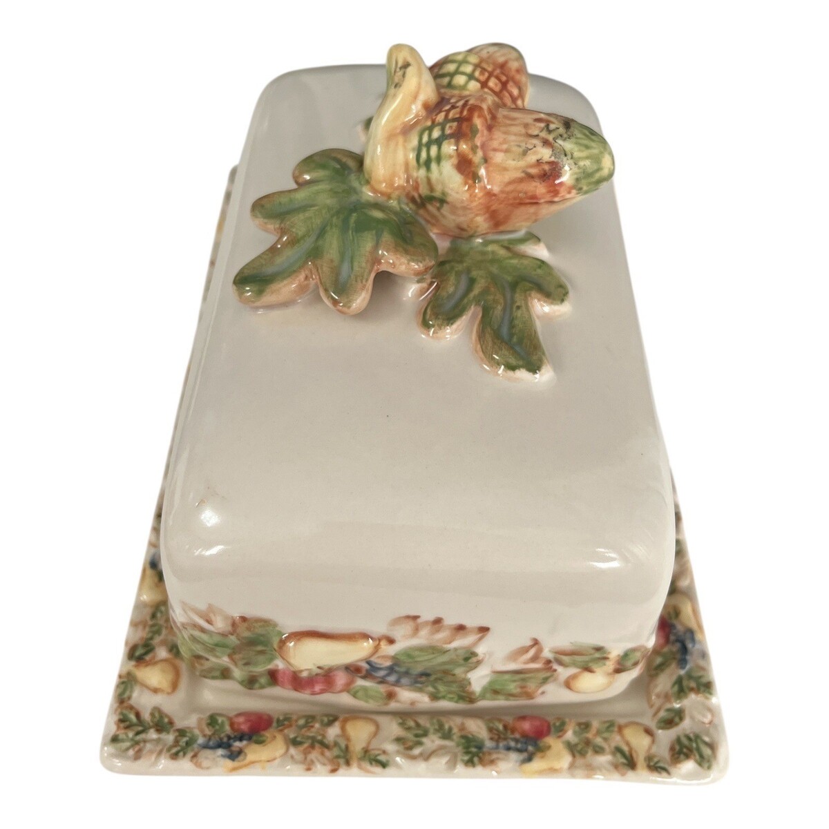 Vintage ceramic butter dish featuring a raised acorn and oak leaf motif on the lid, with a coordinating oak leaf and acorn border around the base. Rectangular covered design with a sculptural lid handle formed as clustered acorns resting on oak leaves. Marked microwave and dishwasher safe on the underside of the tray. A warm, autumn-inspired vintage kitchen piece that works beautifully for everyday use or seasonal display.